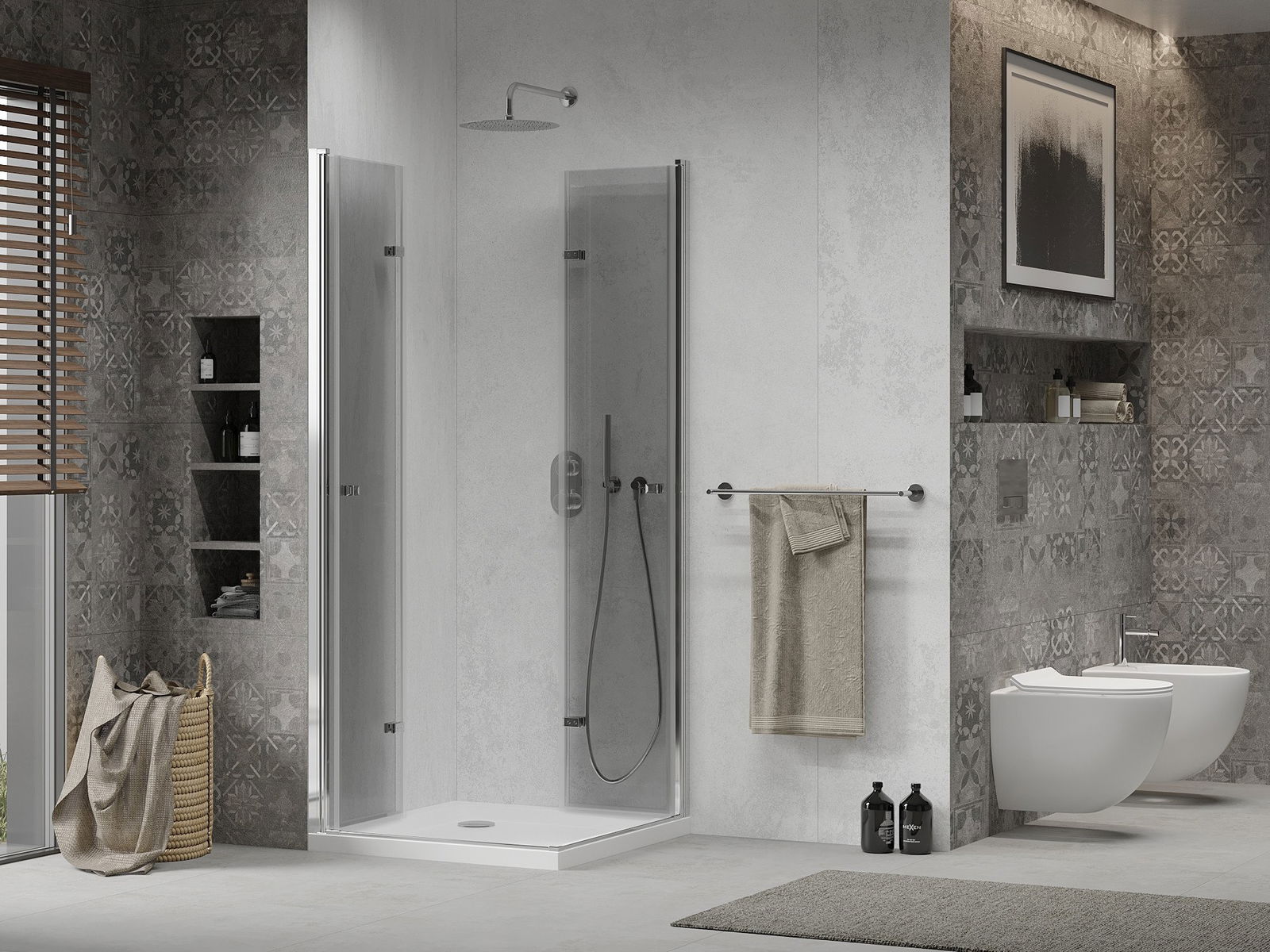 Durch die Möglichkeit, die Tür sowohl außerhalb als auch innen zu falten, können Sie mehr Platz erhalten, wenn Sie die Dusche nicht verwenden. Es ist eine ideale Lösung für kleinere Badezimmer, maximal mit der verfügbaren Oberfläche.