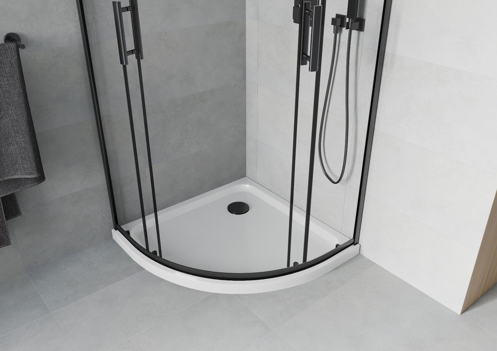Der praktische und bequeme Griff bestand aus langlebigem und widerstandsfähigem Metall. Die modische Form in Kombination mit einem auf die Farbe der Profile zugeschnittenen Finish verleiht dem Ganzen einen modernen und stilvollen Look und betont die Ästhetik jedes Badezimmers.