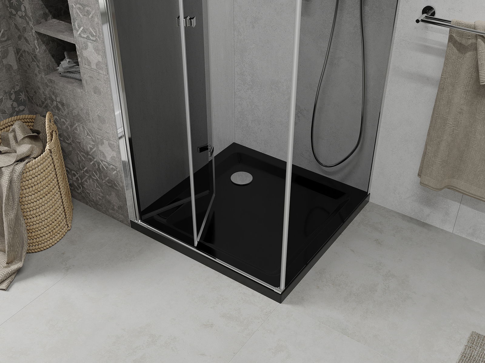 Durch die Möglichkeit, die Tür sowohl außerhalb als auch innen zu falten, können Sie mehr Platz erhalten, wenn Sie die Dusche nicht verwenden. Es ist eine ideale Lösung für kleinere Badezimmer, maximal mit der verfügbaren Oberfläche.
