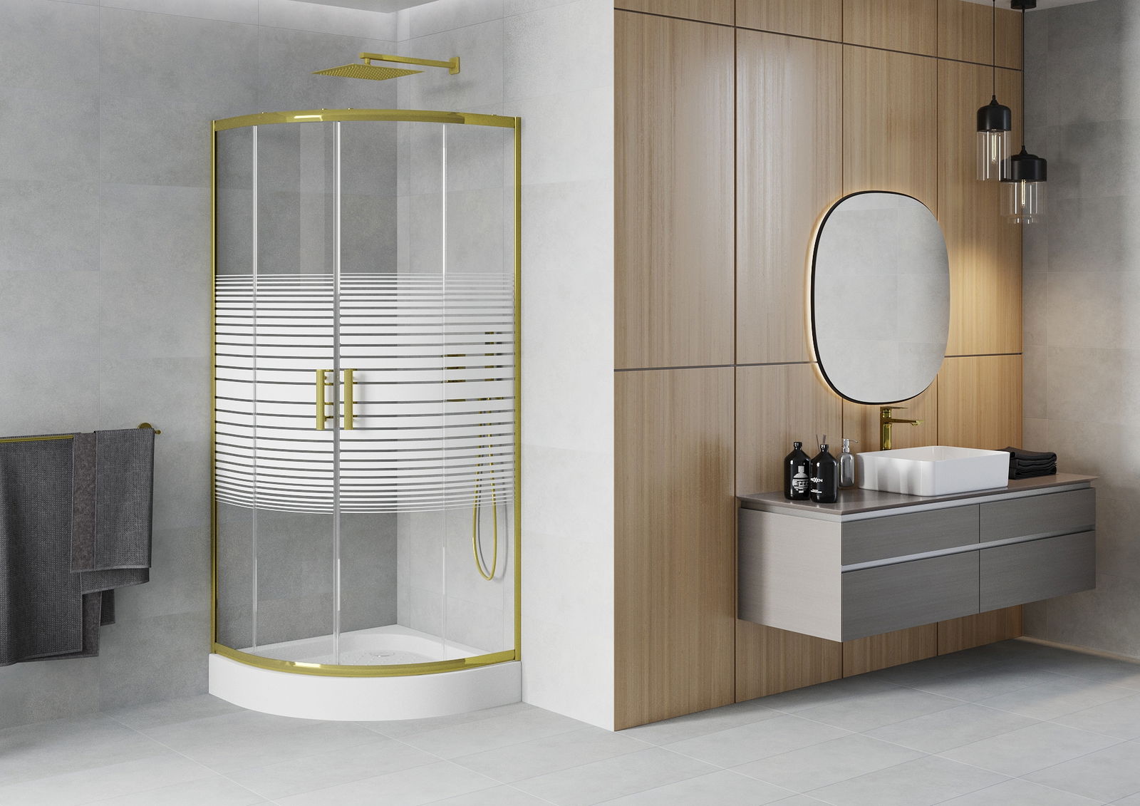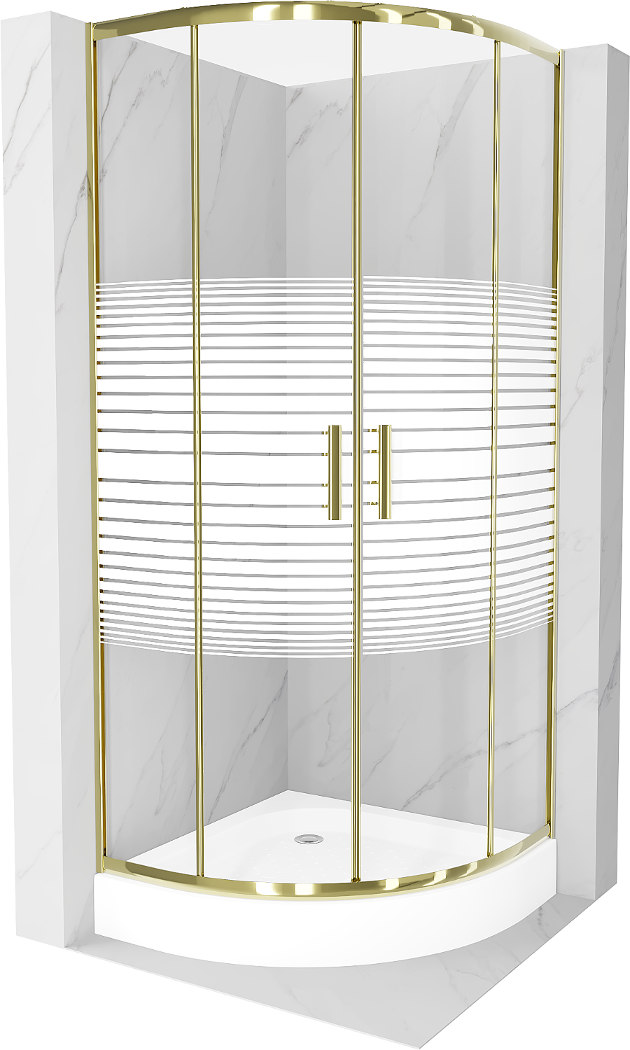 Mexen Rio Halbrunde Duschkabine 90 x 90 cm, weiße Streifen, Gold + Duschwanne, weiß - 863-090-090-50-20-4710