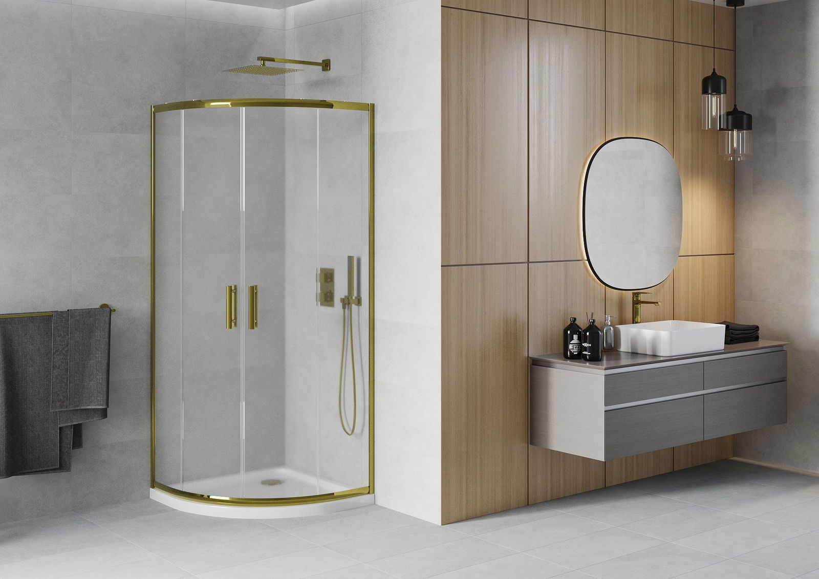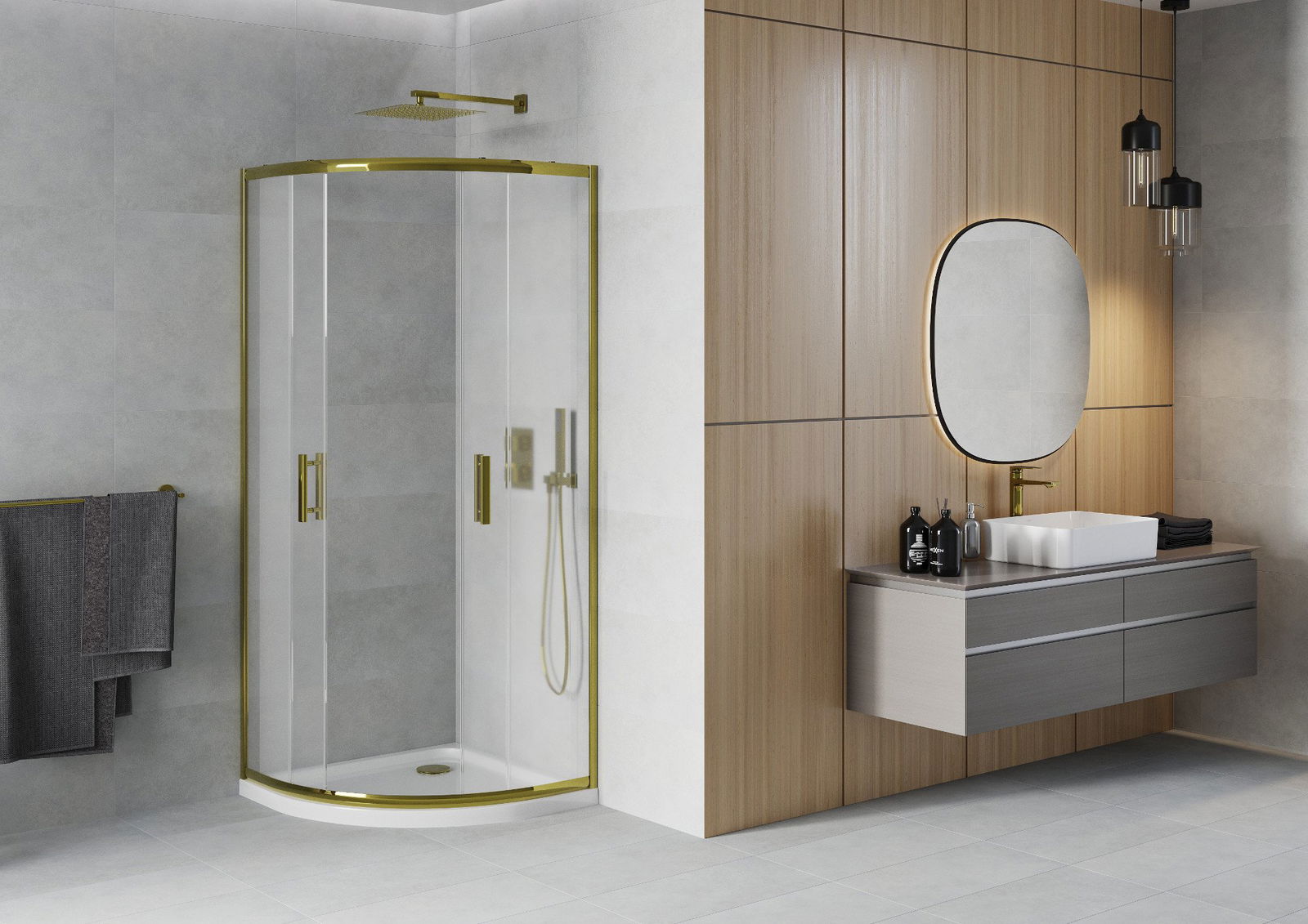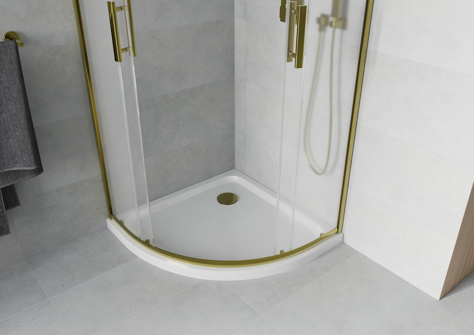 Mexen Rio Duschkabine halbrund 80 x 80 cm, Milchglas, Gold + Duschwanne Flat, Weiß - 863-080-080-50-30-4110G