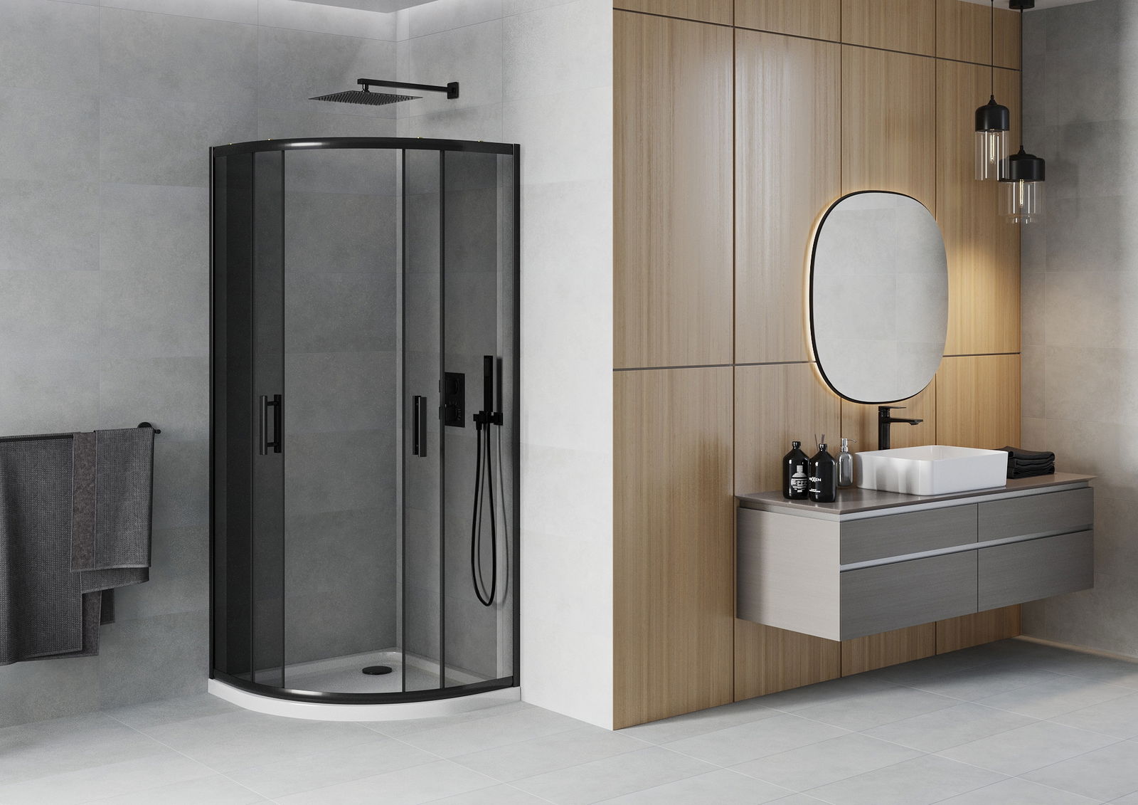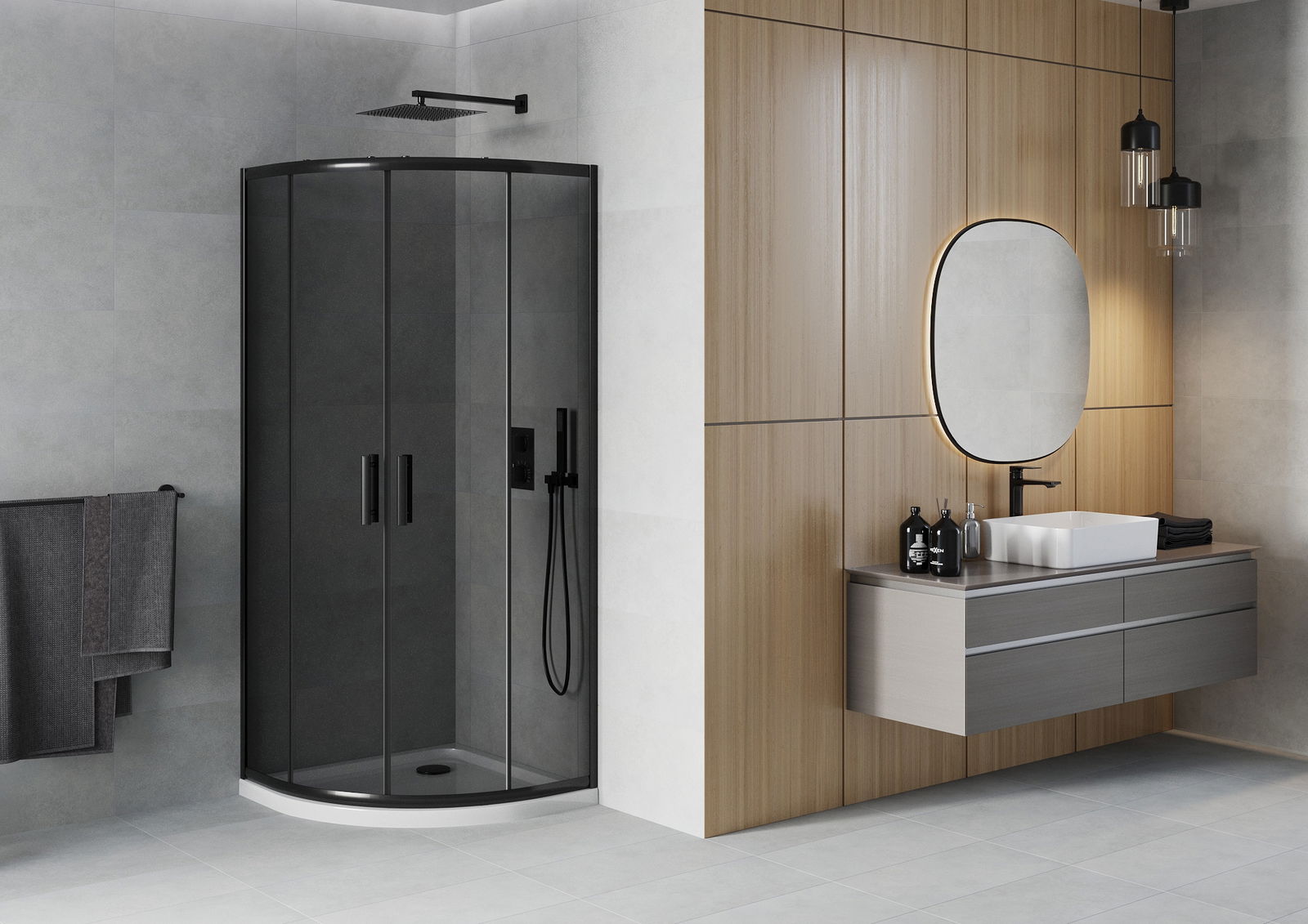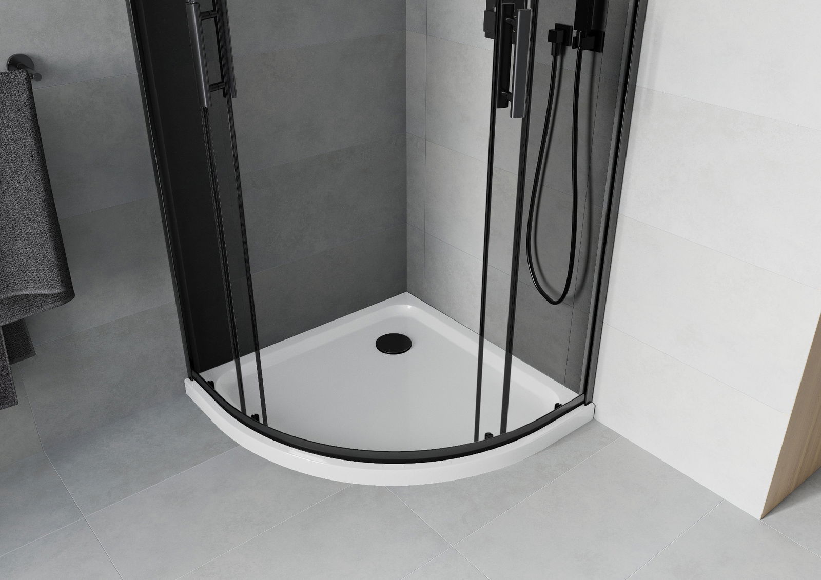 Der praktische und bequeme Griff bestand aus langlebigem und widerstandsfähigem Metall. Die modische Form in Kombination mit einem auf die Farbe der Profile zugeschnittenen Finish verleiht dem Ganzen einen modernen und stilvollen Look und betont die Ästhetik jedes Badezimmers.