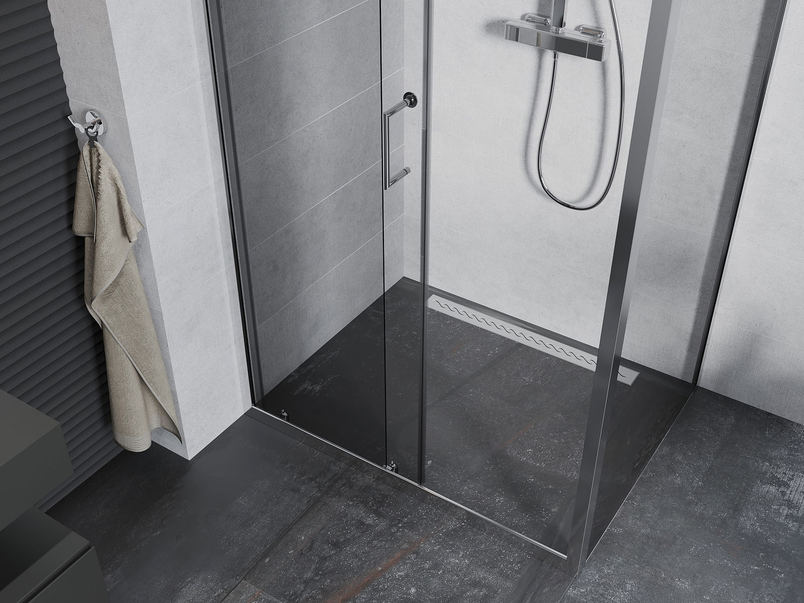 Der praktische und bequeme Griff bestand aus langlebigem und widerstandsfähigem Metall. Die modische Form in Kombination mit einem auf die Farbe der Profile zugeschnittenen Finish verleiht dem Ganzen einen modernen und stilvollen Look und betont die Ästhetik jedes Badezimmers.
