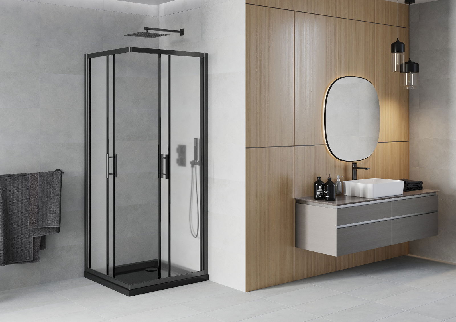 Der praktische und bequeme Griff bestand aus langlebigem und widerstandsfähigem Metall. Die modische Form in Kombination mit einem auf die Farbe der Profile zugeschnittenen Finish verleiht dem Ganzen einen modernen und stilvollen Look und betont die Ästhetik jedes Badezimmers.