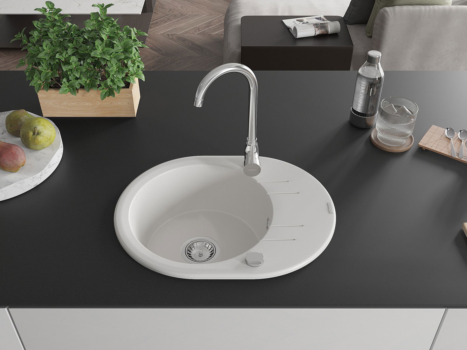 Die Spüle besteht aus hochwertigem Granit. Es ist eine elegante und vor allem praktische Ergänzung zu jeder Küche, unabhängig von ihrem Stil. Hohe Qualität und Granitdauer sorgen für eine langjährige Nutzung.