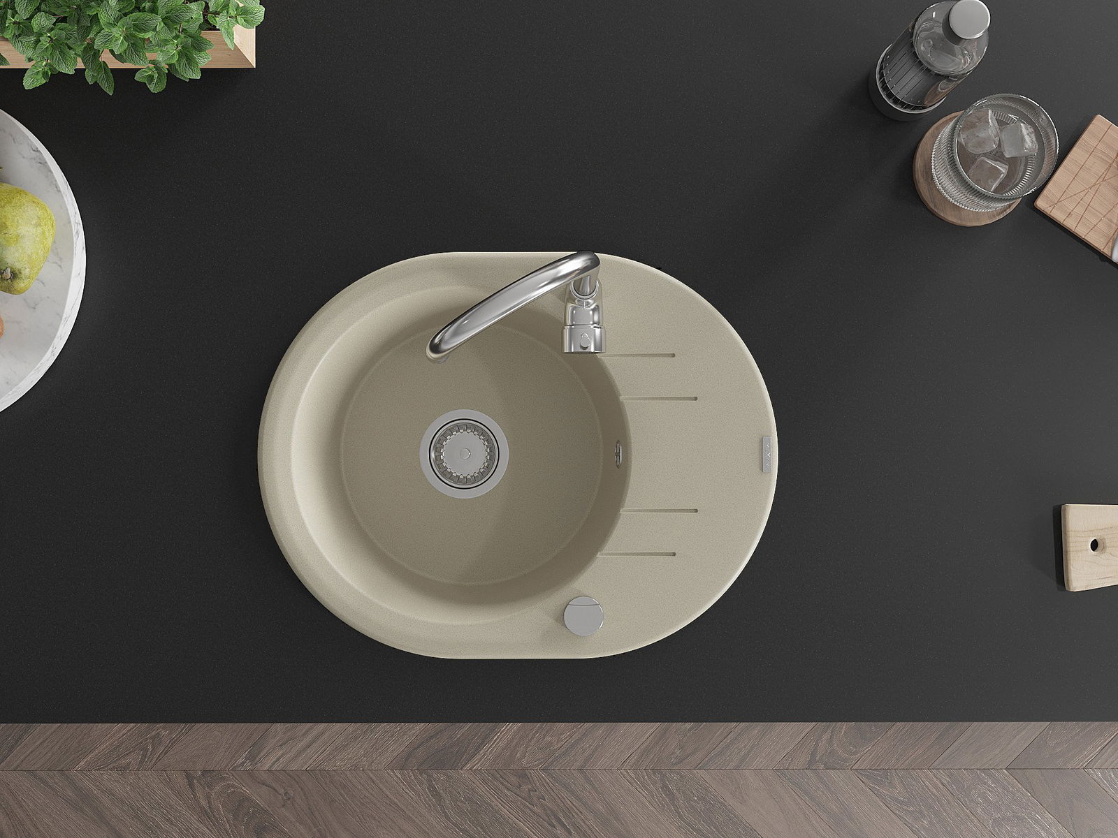 Die Spüle besteht aus hochwertigem Granit. Es ist eine elegante und vor allem praktische Ergänzung zu jeder Küche, unabhängig von ihrem Stil. Hohe Qualität und Granitdauer sorgen für eine langjährige Nutzung.