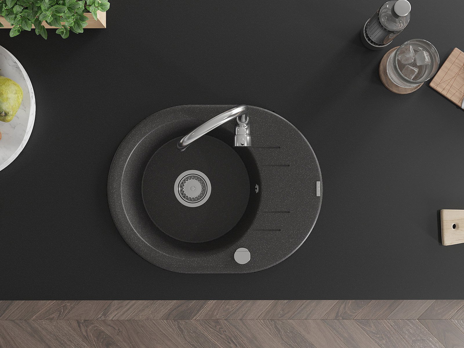 Die Spüle besteht aus hochwertigem Granit. Es ist eine elegante und vor allem praktische Ergänzung zu jeder Küche, unabhängig von ihrem Stil. Hohe Qualität und Granitdauer sorgen für eine langjährige Nutzung.