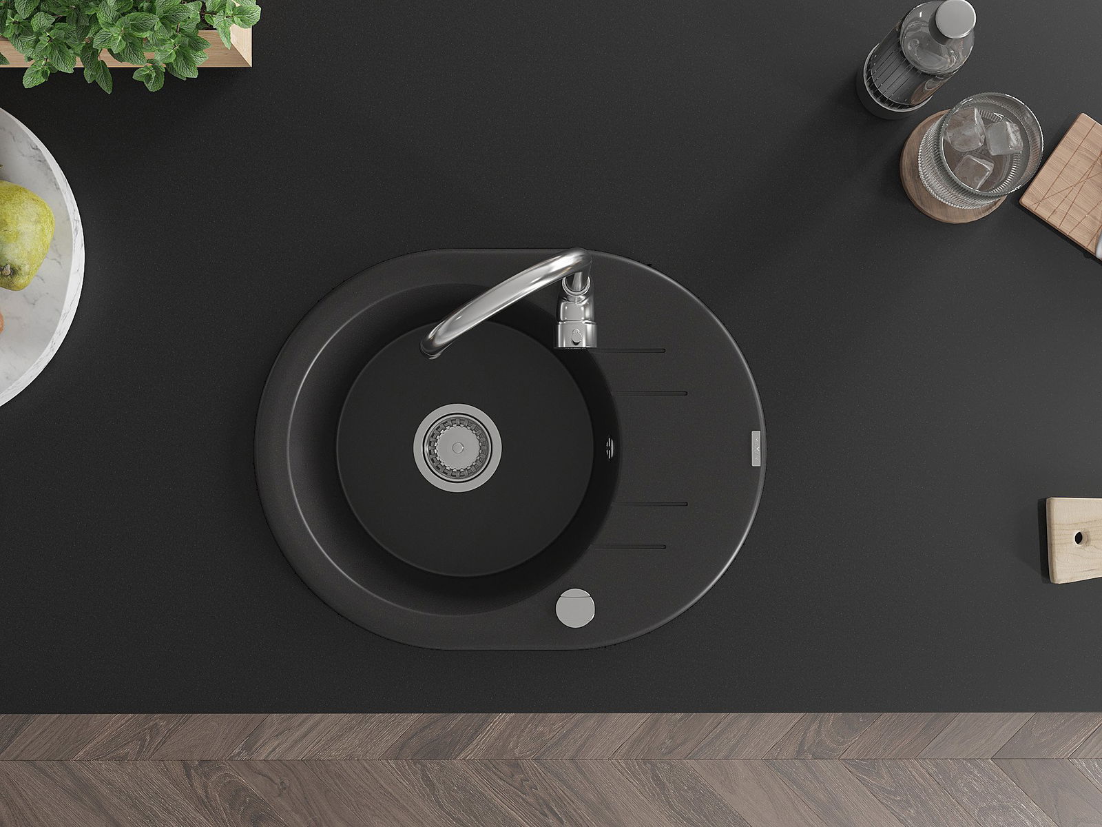 Die Spüle besteht aus hochwertigem Granit. Es ist eine elegante und vor allem praktische Ergänzung zu jeder Küche, unabhängig von ihrem Stil. Hohe Qualität und Granitdauer sorgen für eine langjährige Nutzung.