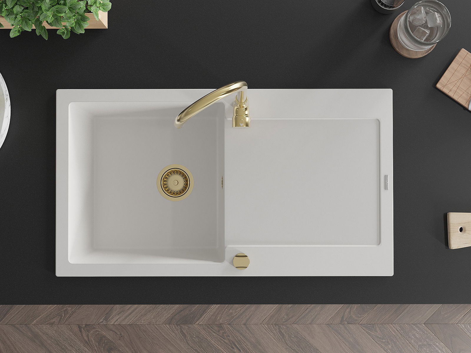 Die Spüle besteht aus hochwertigem Granit. Es ist eine elegante und vor allem praktische Ergänzung zu jeder Küche, unabhängig von ihrem Stil. Hohe Qualität und Granitdauer sorgen für eine langjährige Nutzung.