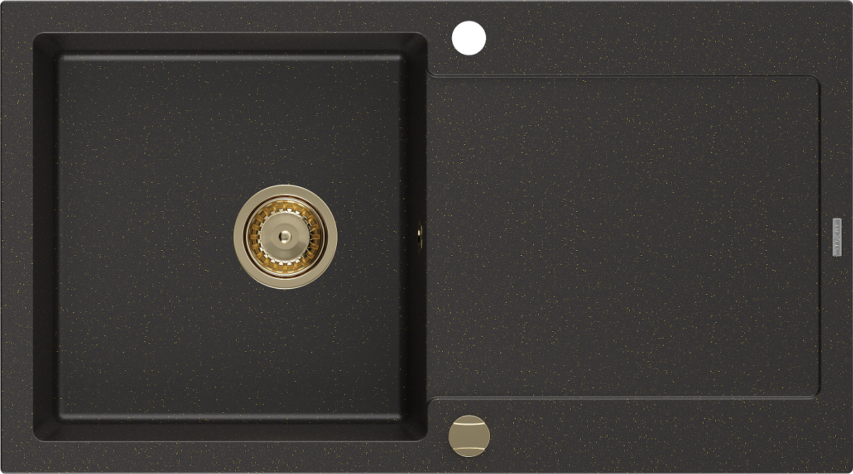 Die Spüle besteht aus hochwertigem Granit. Es ist eine elegante und vor allem praktische Ergänzung zu jeder Küche, unabhängig von ihrem Stil. Hohe Qualität und Granitdauer sorgen für eine langjährige Nutzung.