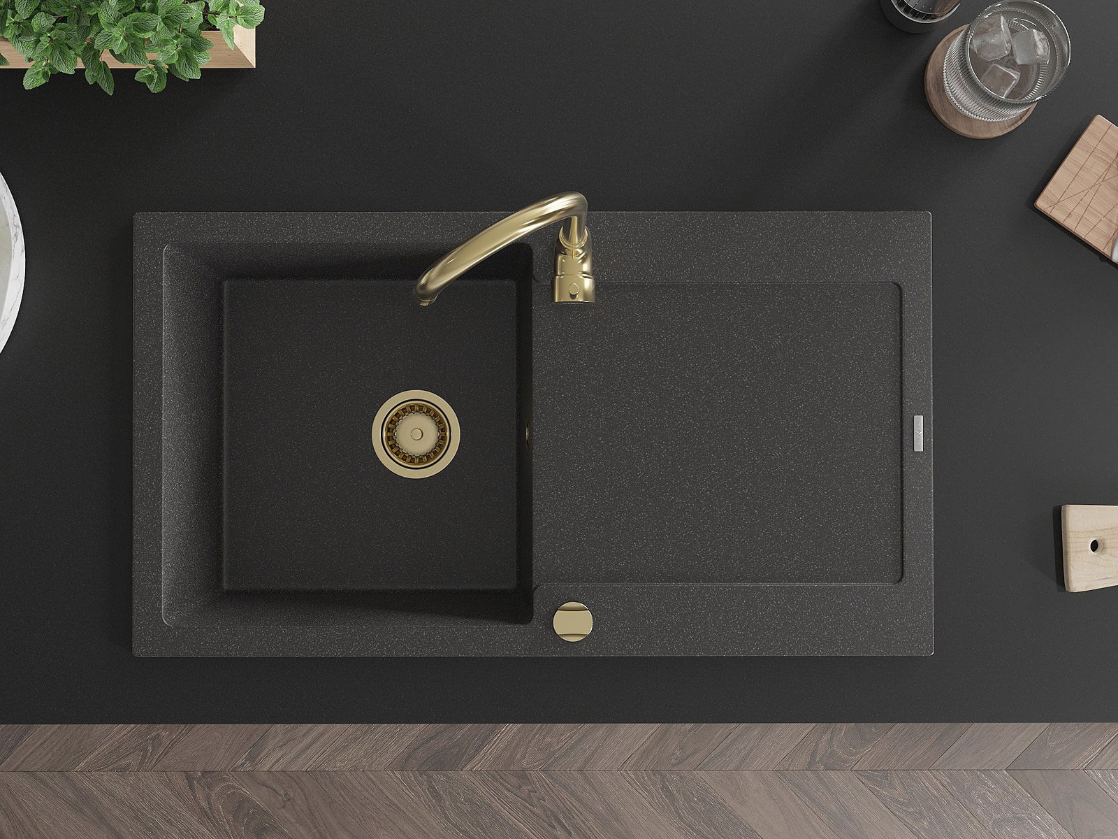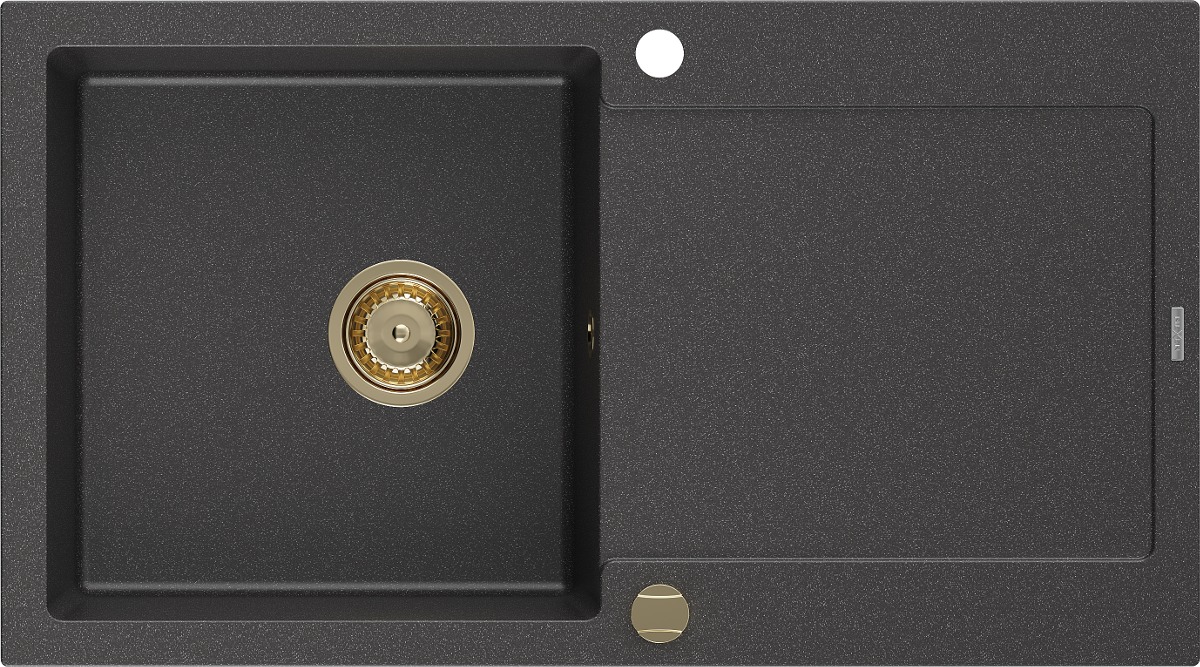 Die Spüle besteht aus hochwertigem Granit. Es ist eine elegante und vor allem praktische Ergänzung zu jeder Küche, unabhängig von ihrem Stil. Hohe Qualität und Granitdauer sorgen für eine langjährige Nutzung.