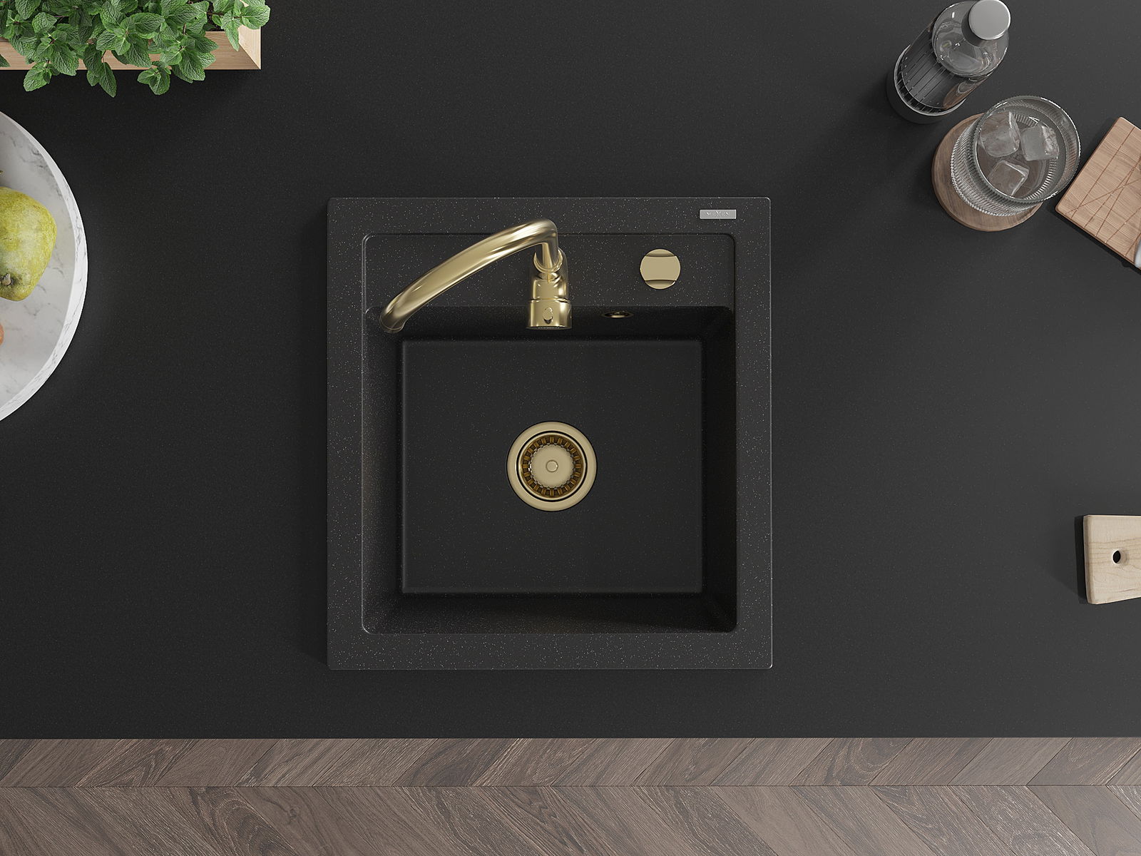 Die Spüle besteht aus hochwertigem Granit. Es ist eine elegante und vor allem praktische Ergänzung zu jeder Küche, unabhängig von ihrem Stil. Hohe Qualität und Granitdauer sorgen für eine langjährige Nutzung.