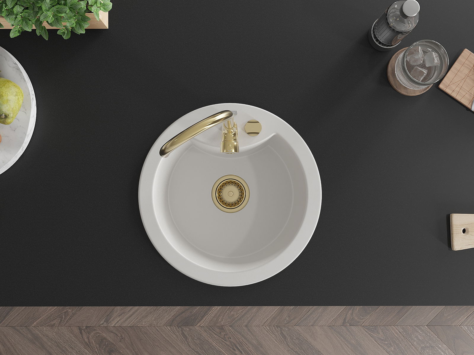 Die Spüle besteht aus hochwertigem Granit. Es ist eine elegante und vor allem praktische Ergänzung zu jeder Küche, unabhängig von ihrem Stil. Hohe Qualität und Granitdauer sorgen für eine langjährige Nutzung.