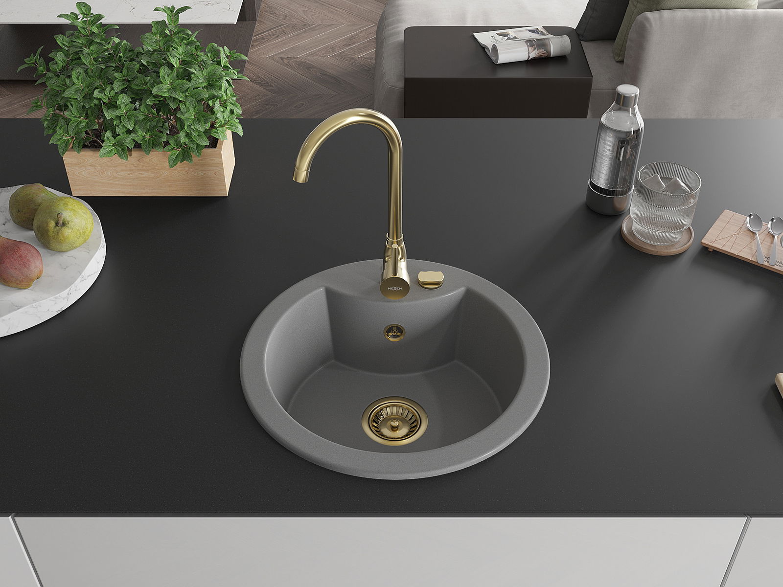 Die Spüle besteht aus hochwertigem Granit. Es ist eine elegante und vor allem praktische Ergänzung zu jeder Küche, unabhängig von ihrem Stil. Hohe Qualität und Granitdauer sorgen für eine langjährige Nutzung.