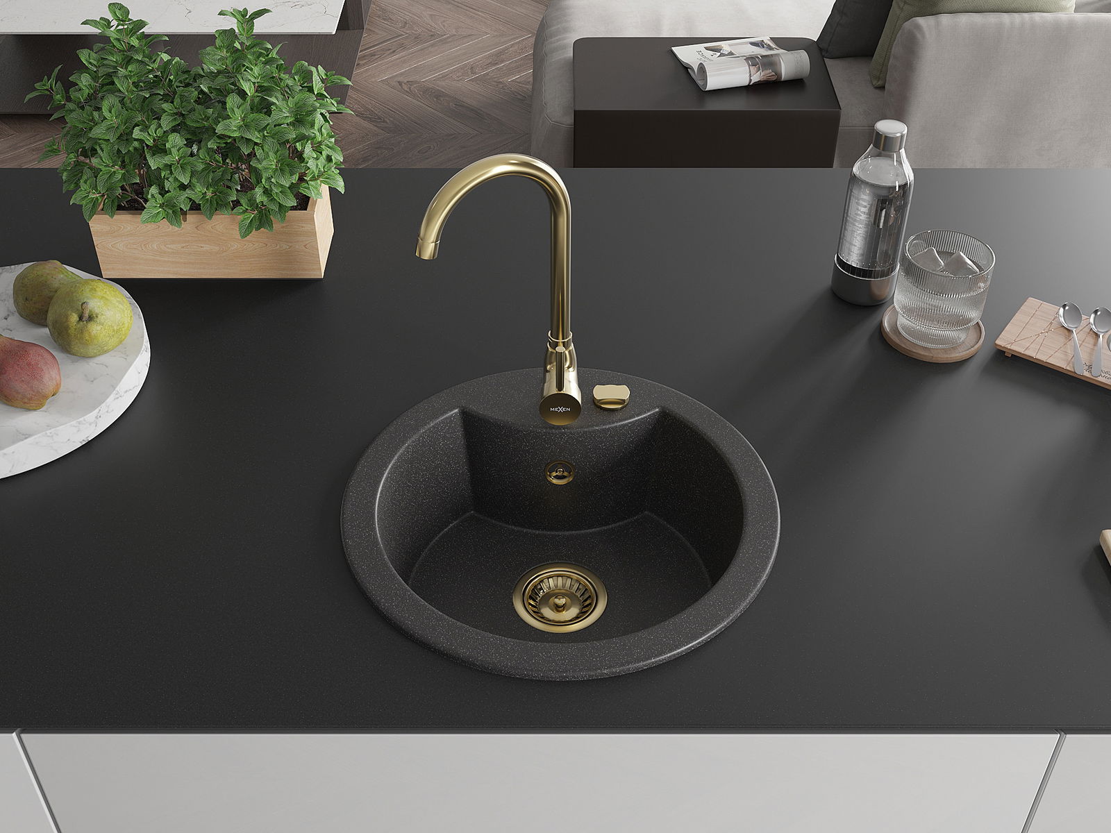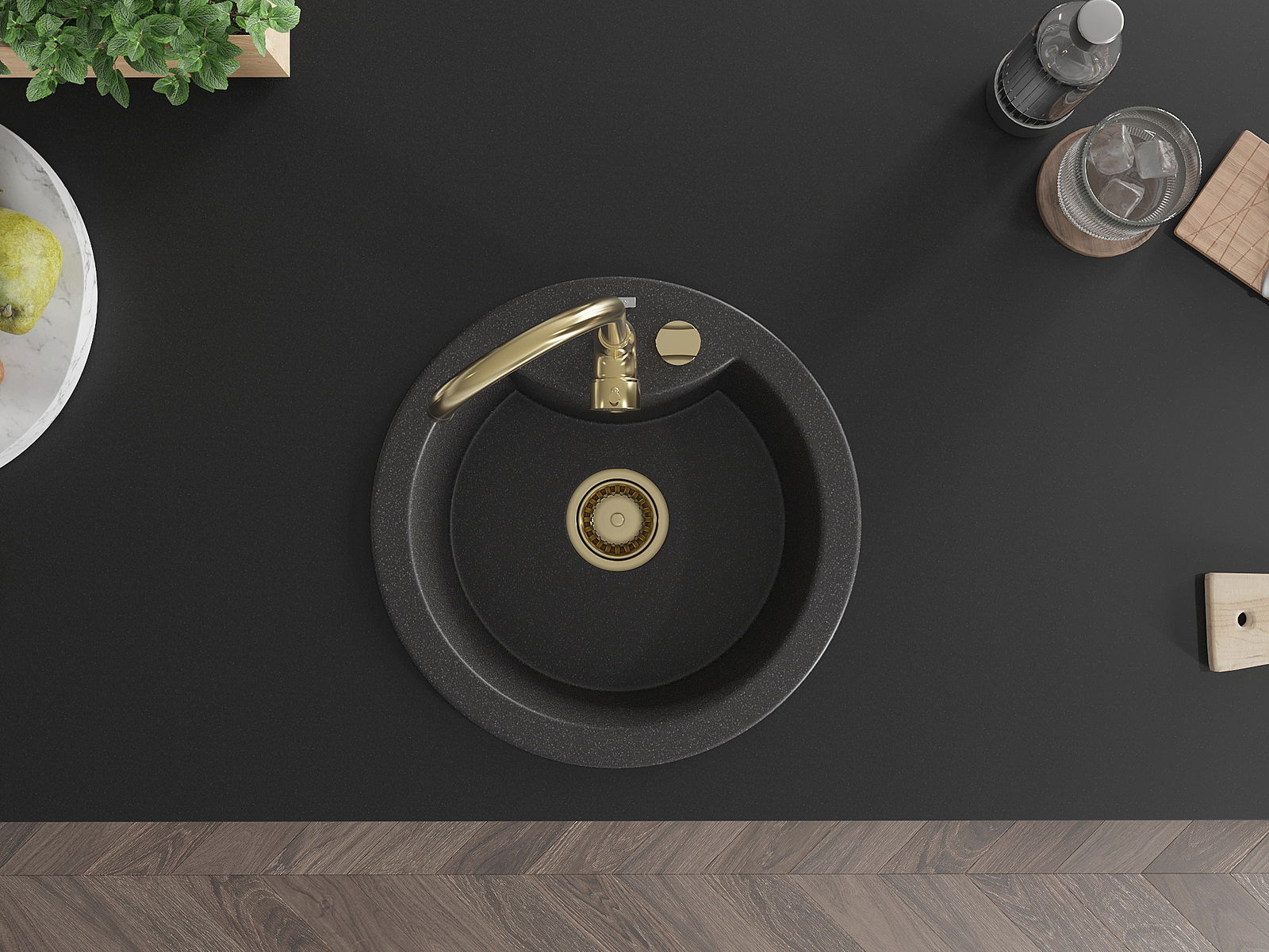 Die Spüle besteht aus hochwertigem Granit. Es ist eine elegante und vor allem praktische Ergänzung zu jeder Küche, unabhängig von ihrem Stil. Hohe Qualität und Granitdauer sorgen für eine langjährige Nutzung.