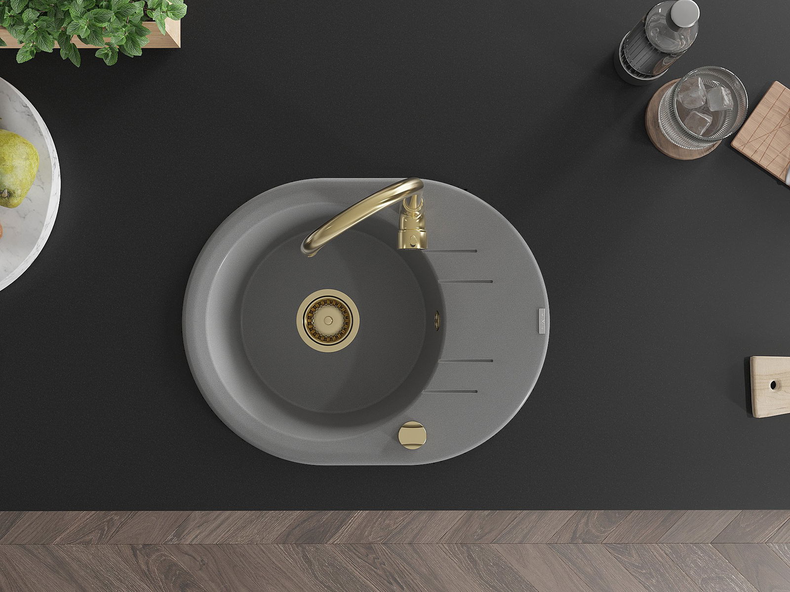 Die Spüle besteht aus hochwertigem Granit. Es ist eine elegante und vor allem praktische Ergänzung zu jeder Küche, unabhängig von ihrem Stil. Hohe Qualität und Granitdauer sorgen für eine langjährige Nutzung.
