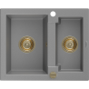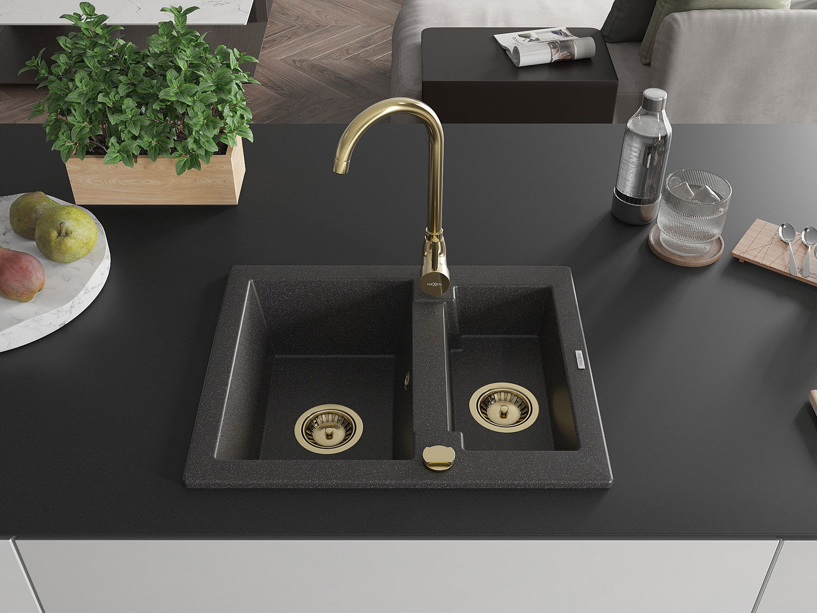 Die Spüle besteht aus hochwertigem Granit. Es ist eine elegante und vor allem praktische Ergänzung zu jeder Küche, unabhängig von ihrem Stil. Hohe Qualität und Granitdauer sorgen für eine langjährige Nutzung.