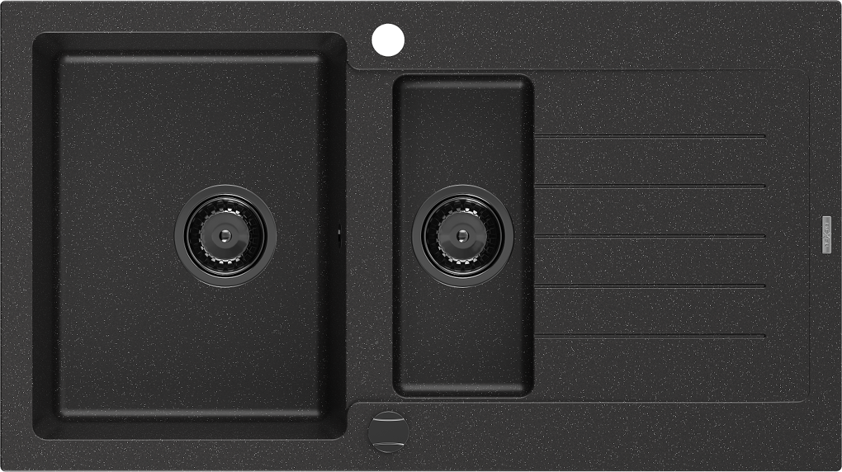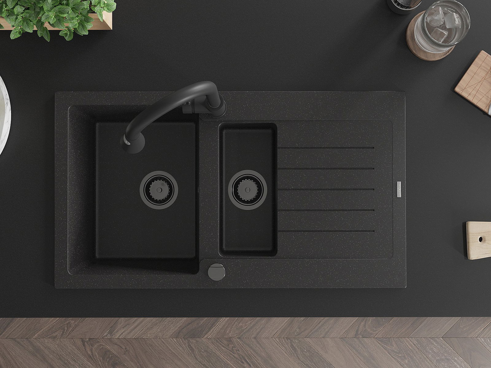 Die Spüle besteht aus hochwertigem Granit. Es ist eine elegante und vor allem praktische Ergänzung zu jeder Küche, unabhängig von ihrem Stil. Hohe Qualität und Granitdauer sorgen für eine langjährige Nutzung.