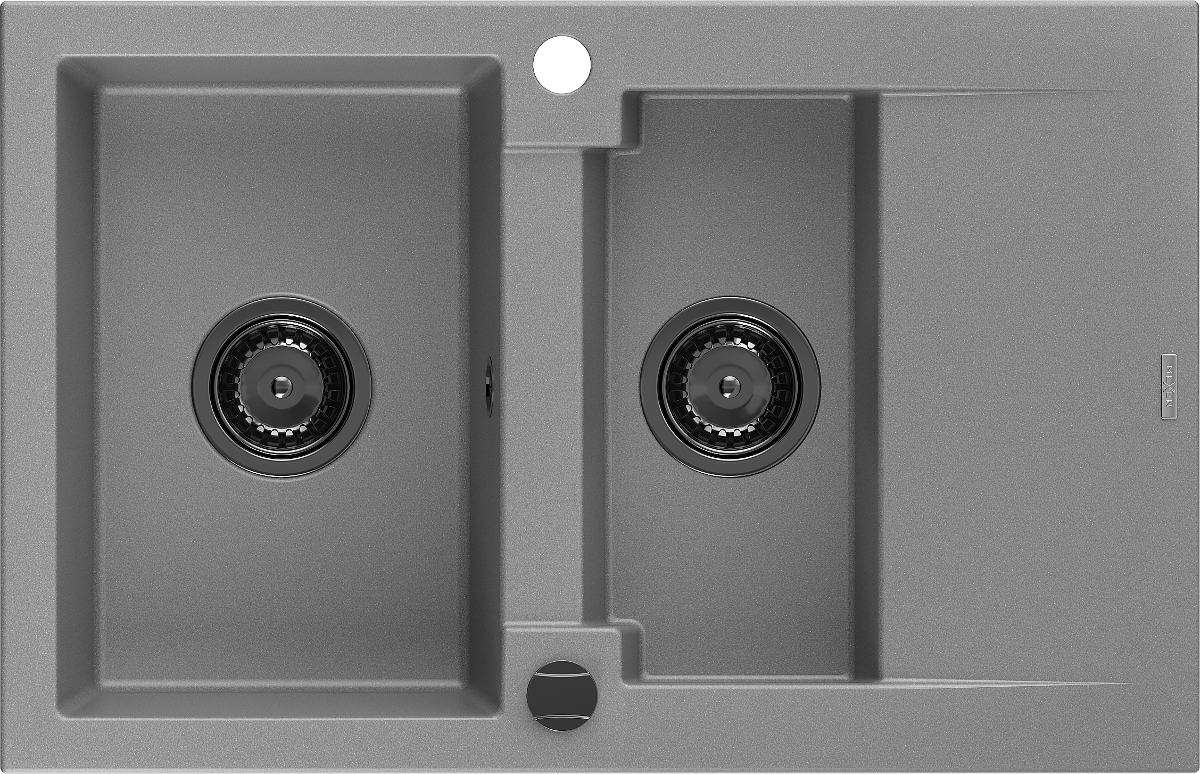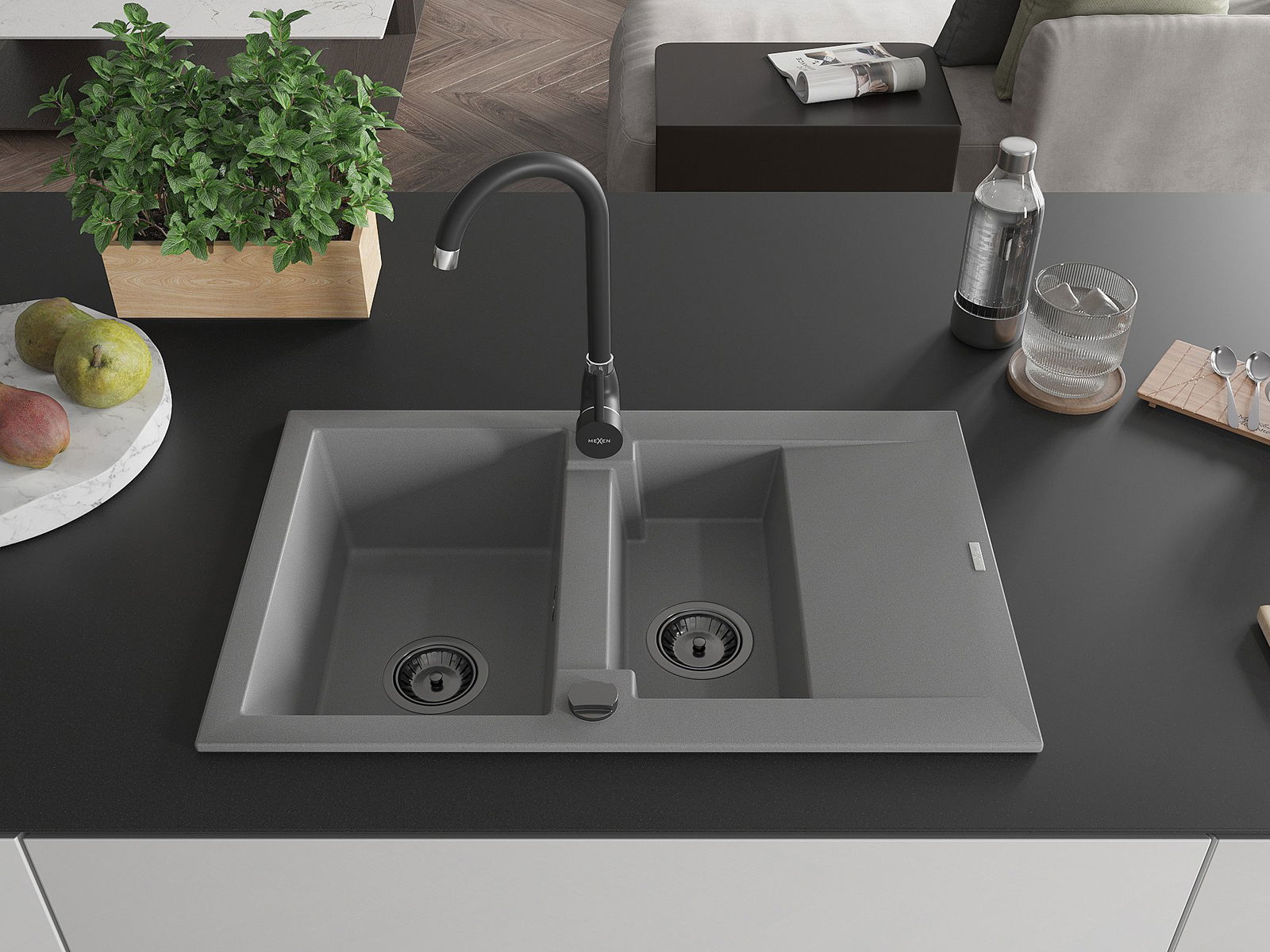Die Spüle besteht aus hochwertigem Granit. Es ist eine elegante und vor allem praktische Ergänzung zu jeder Küche, unabhängig von ihrem Stil. Hohe Qualität und Granitdauer sorgen für eine langjährige Nutzung.