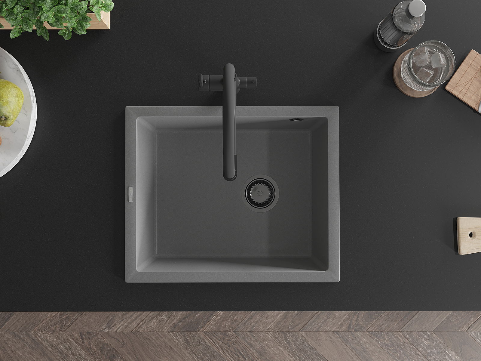 Die Spüle besteht aus hochwertigem Granit. Es ist eine elegante und vor allem praktische Ergänzung zu jeder Küche, unabhängig von ihrem Stil. Hohe Qualität und Granitdauer sorgen für eine langjährige Nutzung.