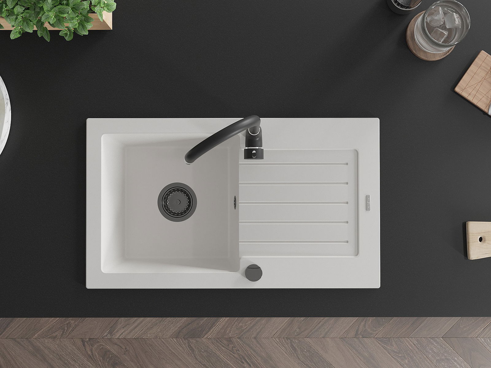 Die Spüle besteht aus hochwertigem Granit. Es ist eine elegante und vor allem praktische Ergänzung zu jeder Küche, unabhängig von ihrem Stil. Hohe Qualität und Granitdauer sorgen für eine langjährige Nutzung.