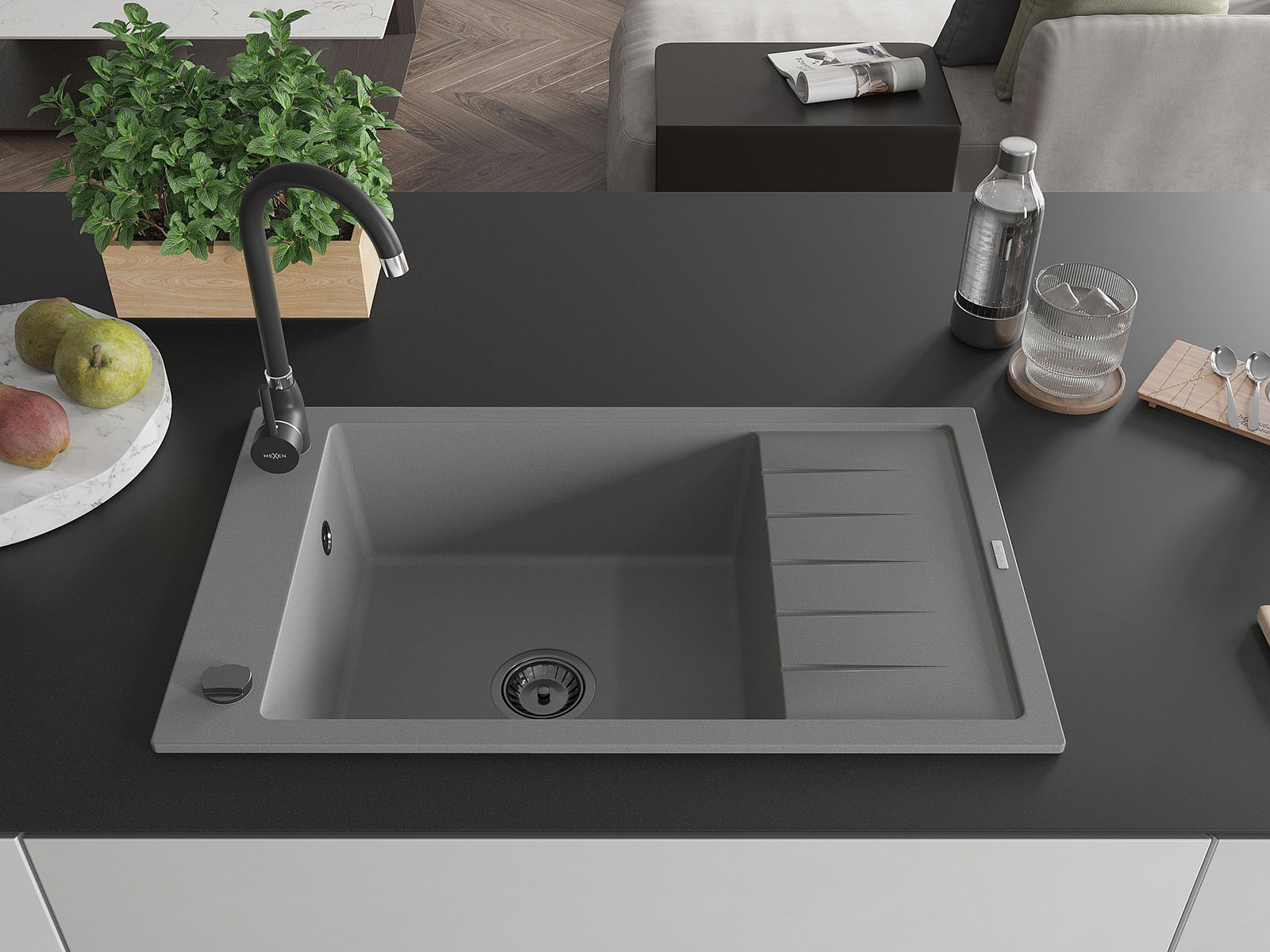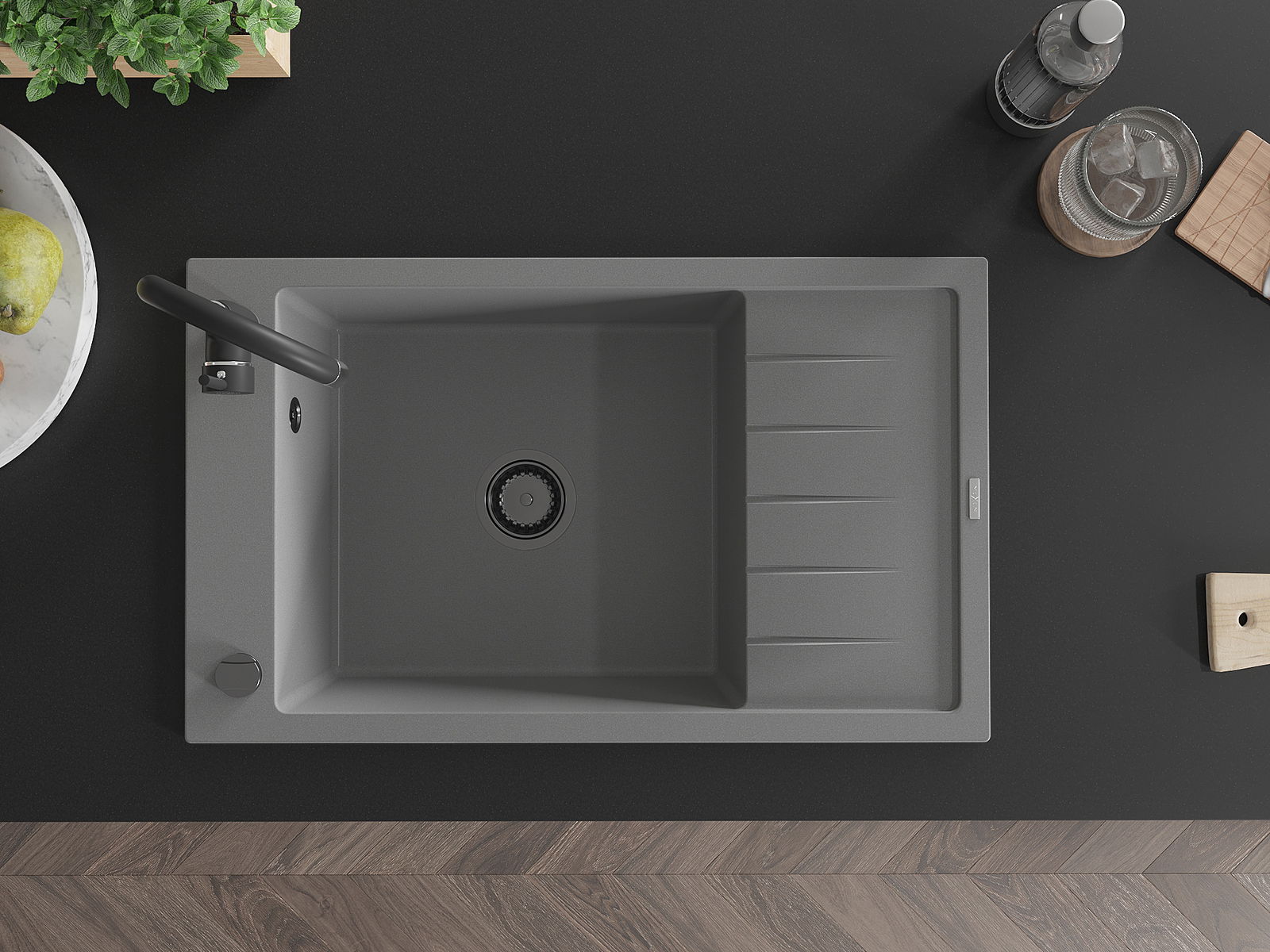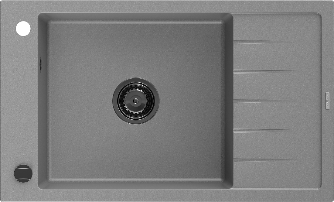 Die Spüle besteht aus hochwertigem Granit. Es ist eine elegante und vor allem praktische Ergänzung zu jeder Küche, unabhängig von ihrem Stil. Hohe Qualität und Granitdauer sorgen für eine langjährige Nutzung.