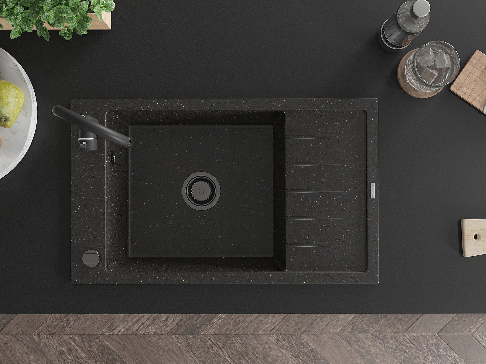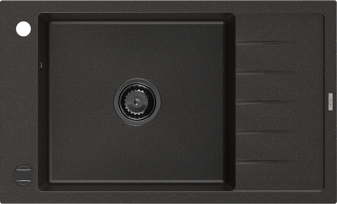 Die Spüle besteht aus hochwertigem Granit. Es ist eine elegante und vor allem praktische Ergänzung zu jeder Küche, unabhängig von ihrem Stil. Hohe Qualität und Granitdauer sorgen für eine langjährige Nutzung.