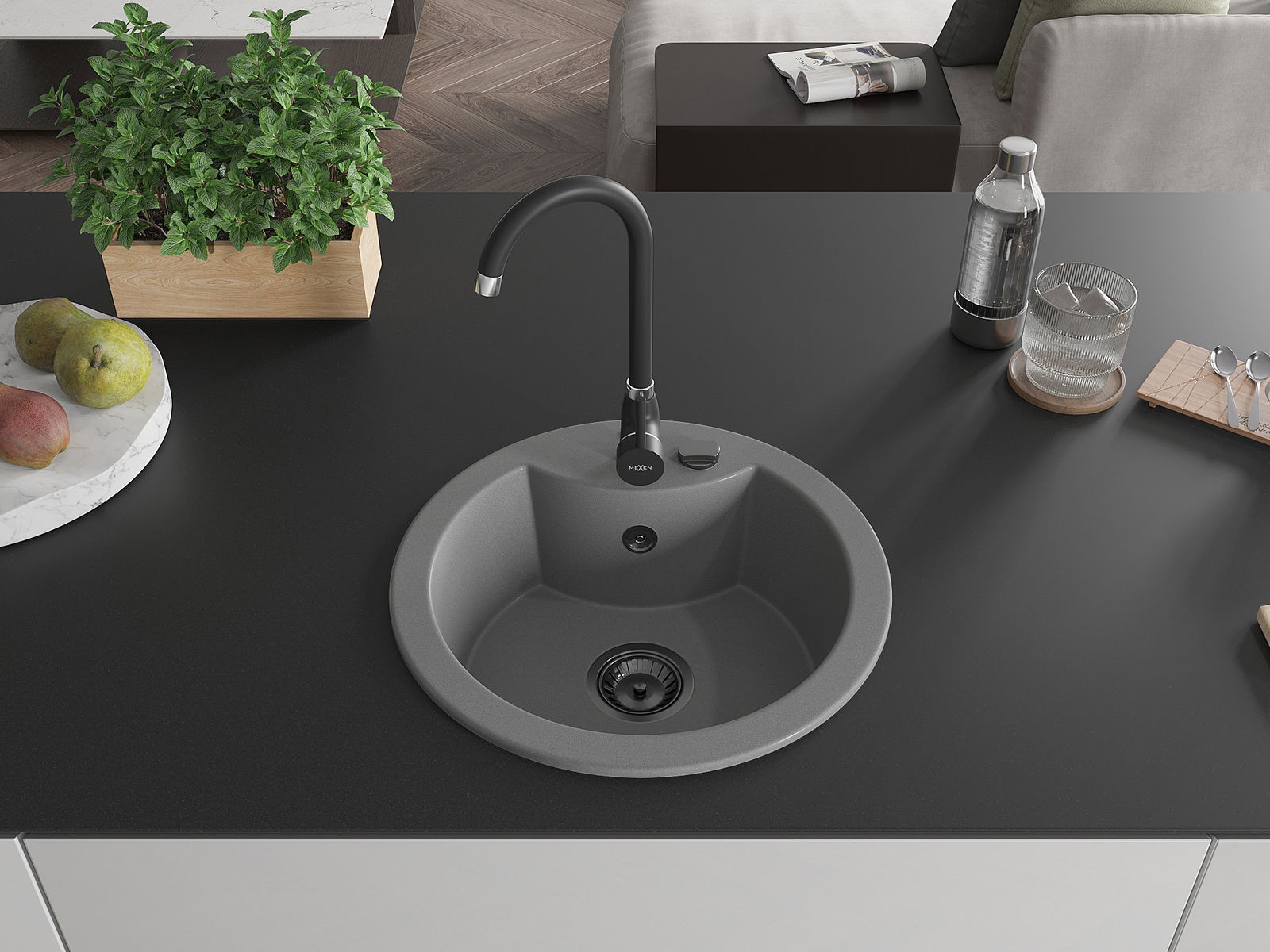 Die Spüle besteht aus hochwertigem Granit. Es ist eine elegante und vor allem praktische Ergänzung zu jeder Küche, unabhängig von ihrem Stil. Hohe Qualität und Granitdauer sorgen für eine langjährige Nutzung.