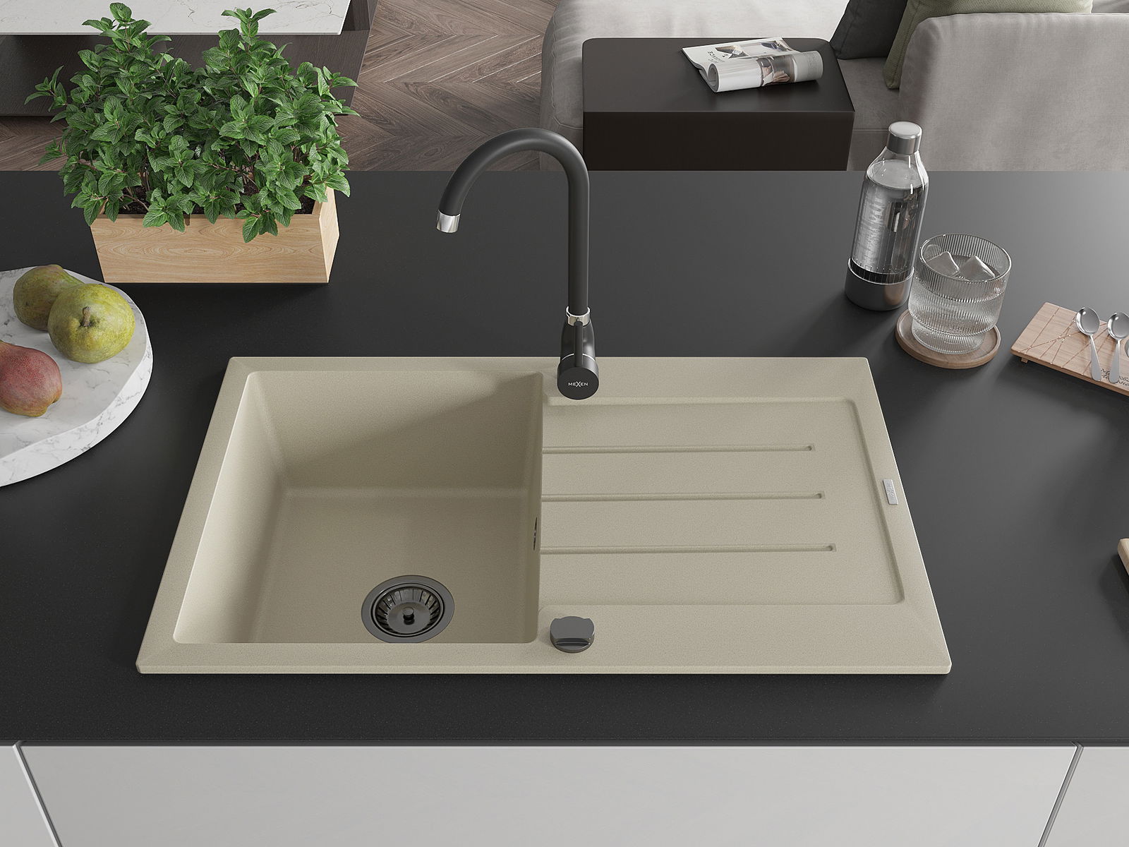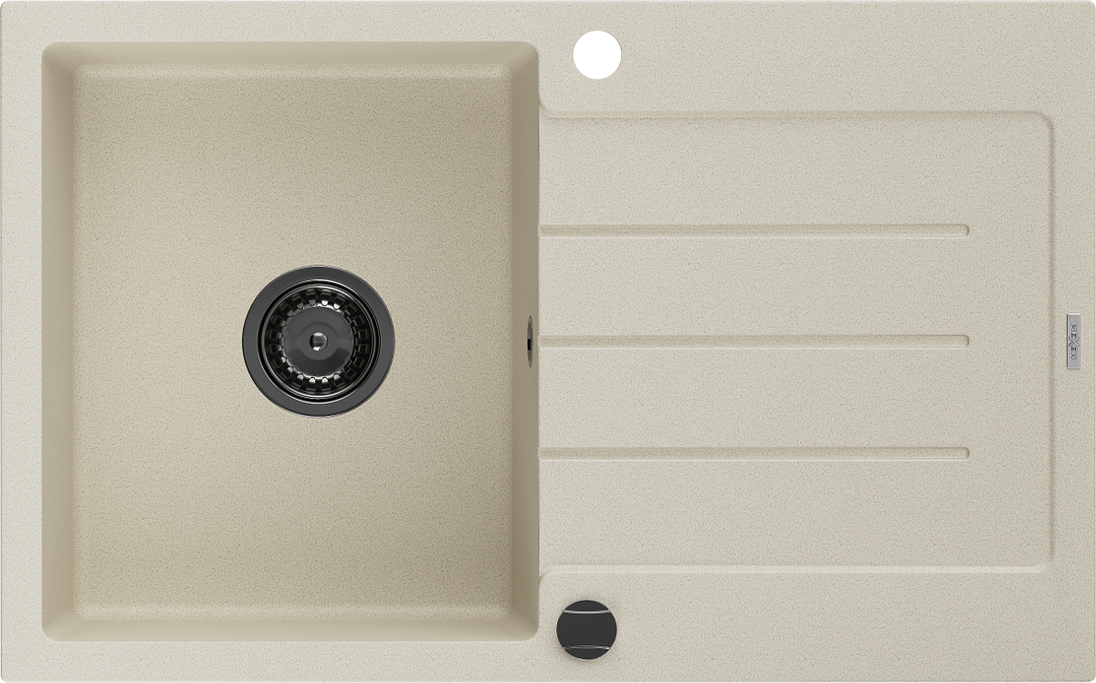 Die Spüle besteht aus hochwertigem Granit. Es ist eine elegante und vor allem praktische Ergänzung zu jeder Küche, unabhängig von ihrem Stil. Hohe Qualität und Granitdauer sorgen für eine langjährige Nutzung.