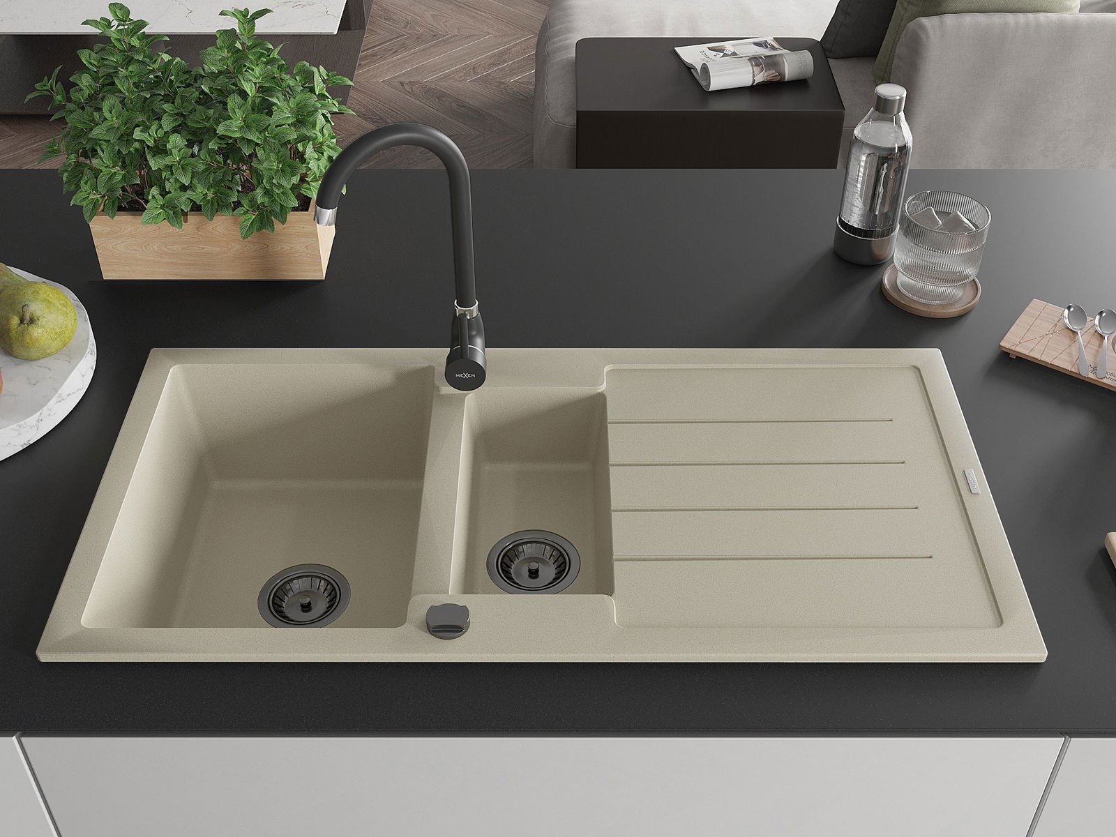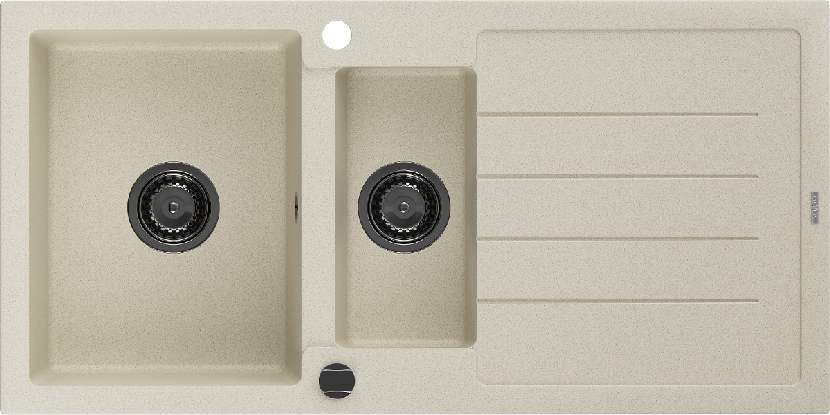 Die Spüle besteht aus hochwertigem Granit. Es ist eine elegante und vor allem praktische Ergänzung zu jeder Küche, unabhängig von ihrem Stil. Hohe Qualität und Granitdauer sorgen für eine langjährige Nutzung.