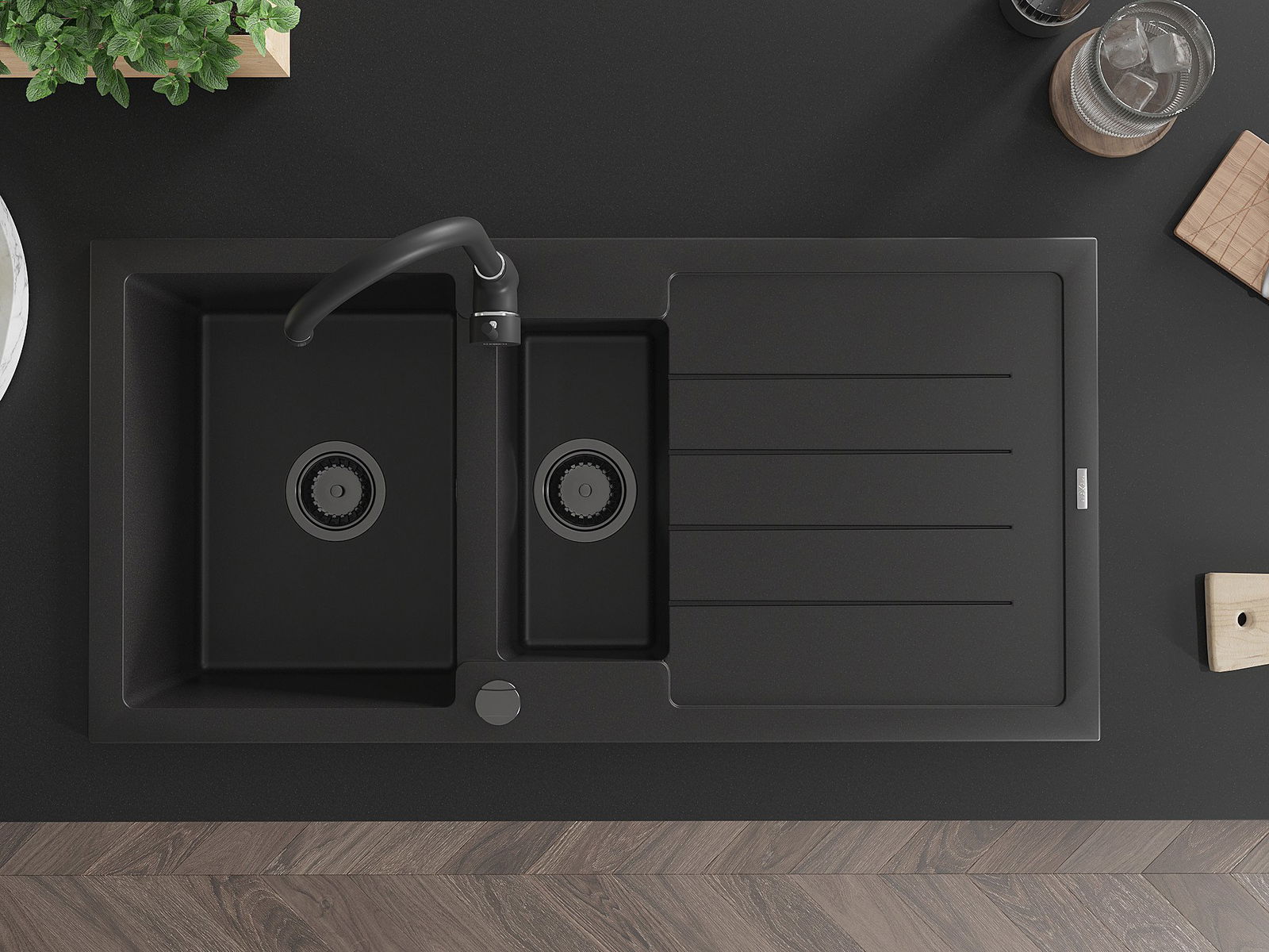 Dank des universellen Montagesystems ist die Spüle reversibel und der Abfluss kann links oder rechts auf der Theke montiert werden. Auf diese Weise können Sie die Seite einfach an Ihre Bedürfnisse und Bedingungen einstellen.