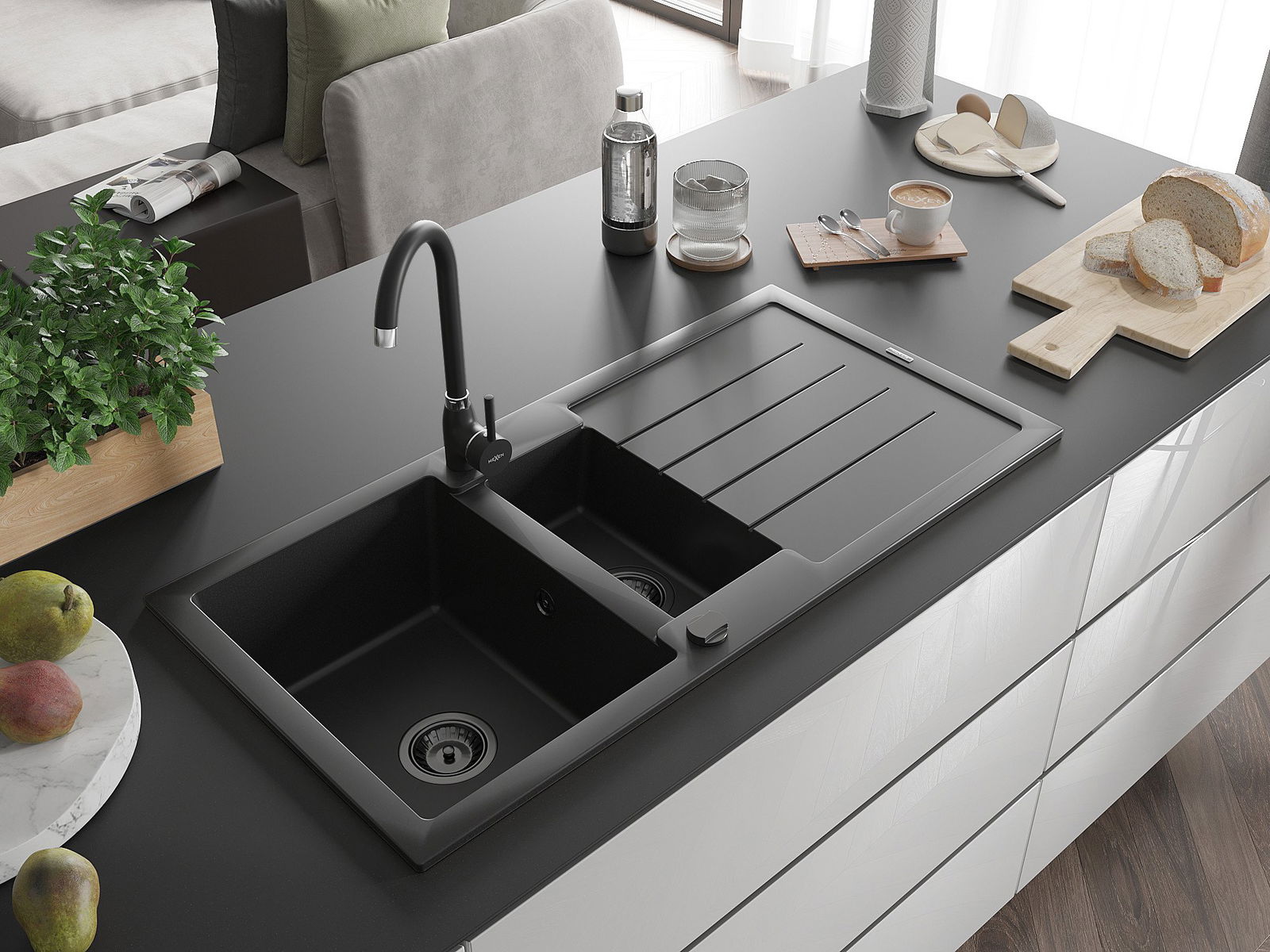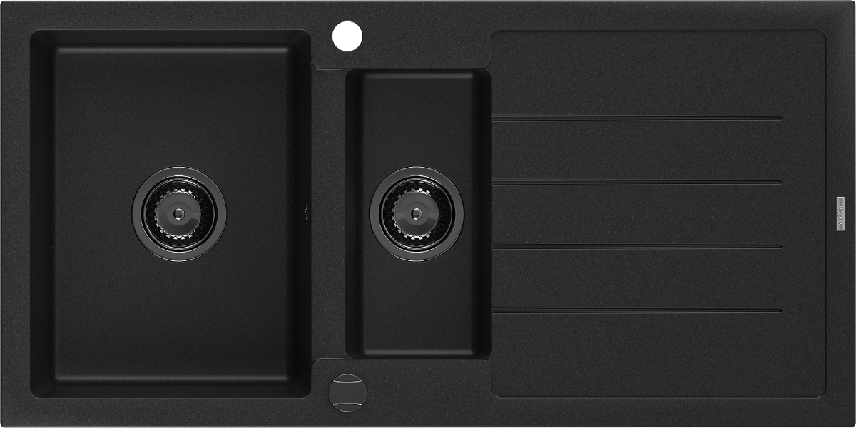 Die Spüle besteht aus hochwertigem Granit. Es ist eine elegante und vor allem praktische Ergänzung zu jeder Küche, unabhängig von ihrem Stil. Hohe Qualität und Granitdauer sorgen für eine langjährige Nutzung.
