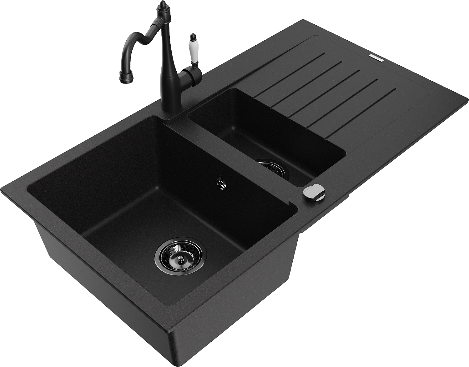 Mexen Matias Granitspüle 1,5-Becken mit Abtropffläche und Küchenarmatur Carla, schwarz - 6502-77-670700-70-B