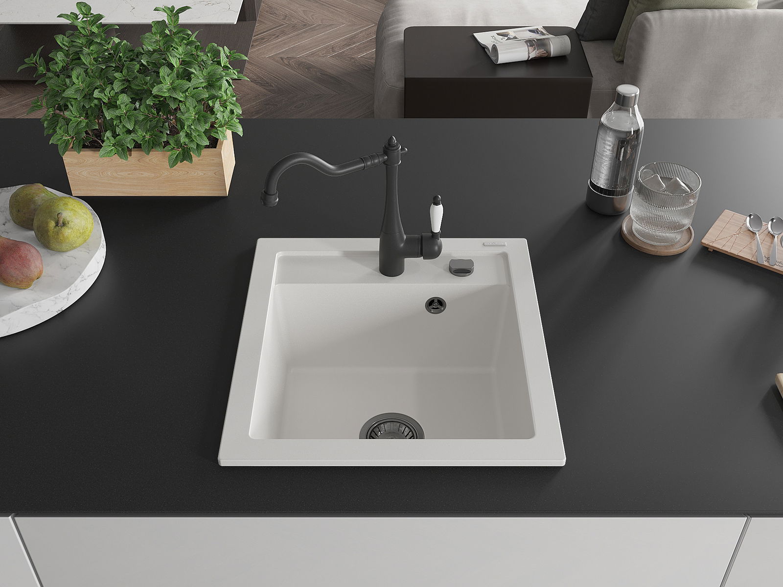 Die Spüle besteht aus hochwertigem Granit. Es ist eine elegante und vor allem praktische Ergänzung zu jeder Küche, unabhängig von ihrem Stil. Hohe Qualität und Granitdauer sorgen für eine langjährige Nutzung.