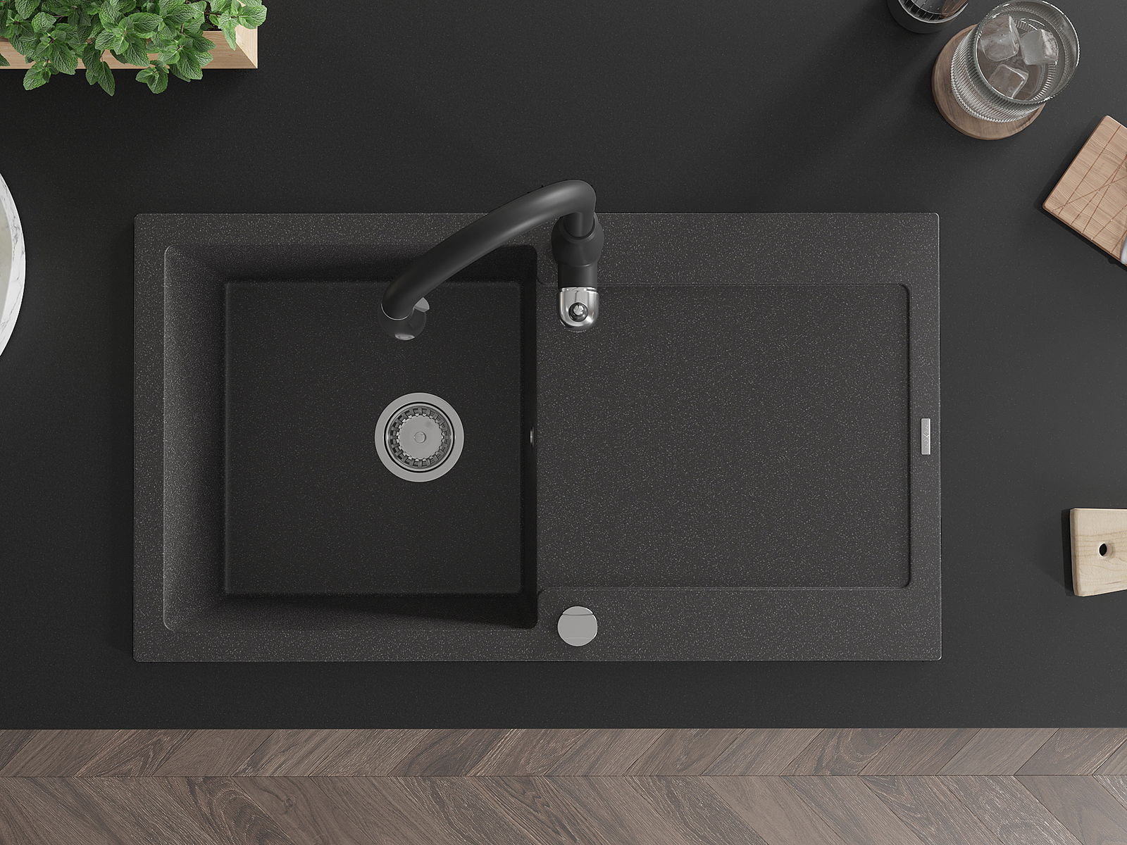 Mexen Leo Granitspüle 1-beckig mit Abtropffläche und Küchenarmatur Savita, schwarz gesprenkelt - 6501-76-672601-70