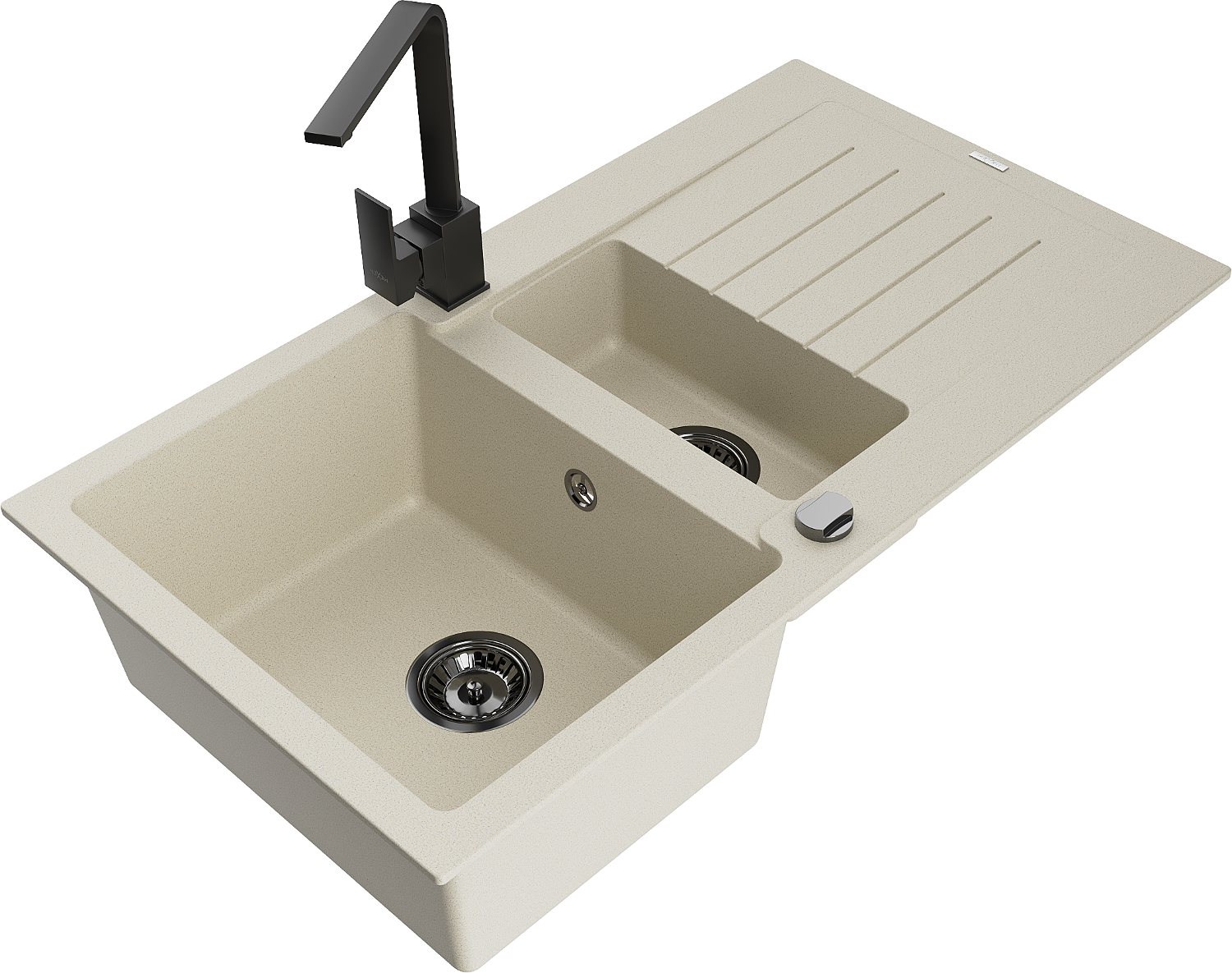 Mexen Matias Granitspüle 1,5 Kammern mit Abtropffläche und Küchenarmatur Rita, beige - 6502-69-670300-70