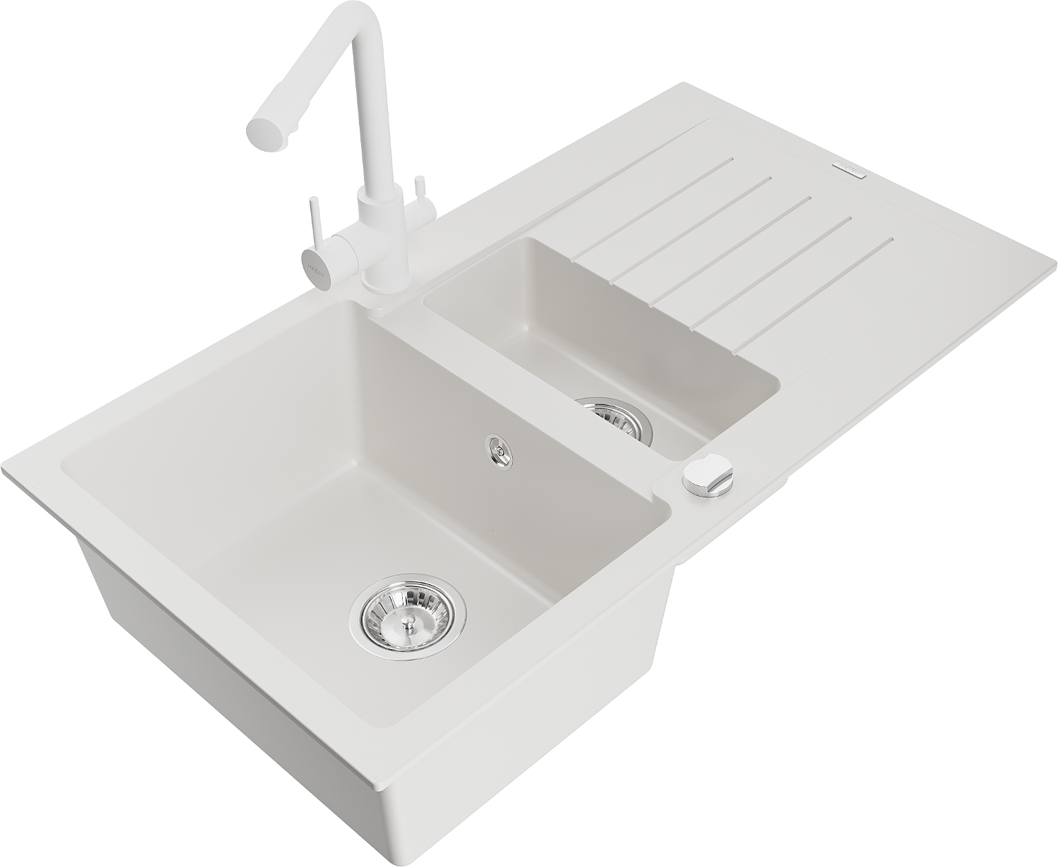 Mexen Matias Granitspüle 1,5-beckig mit Abtropffläche und Küchenarmatur Duero, weiß - 6502-20-671600-20