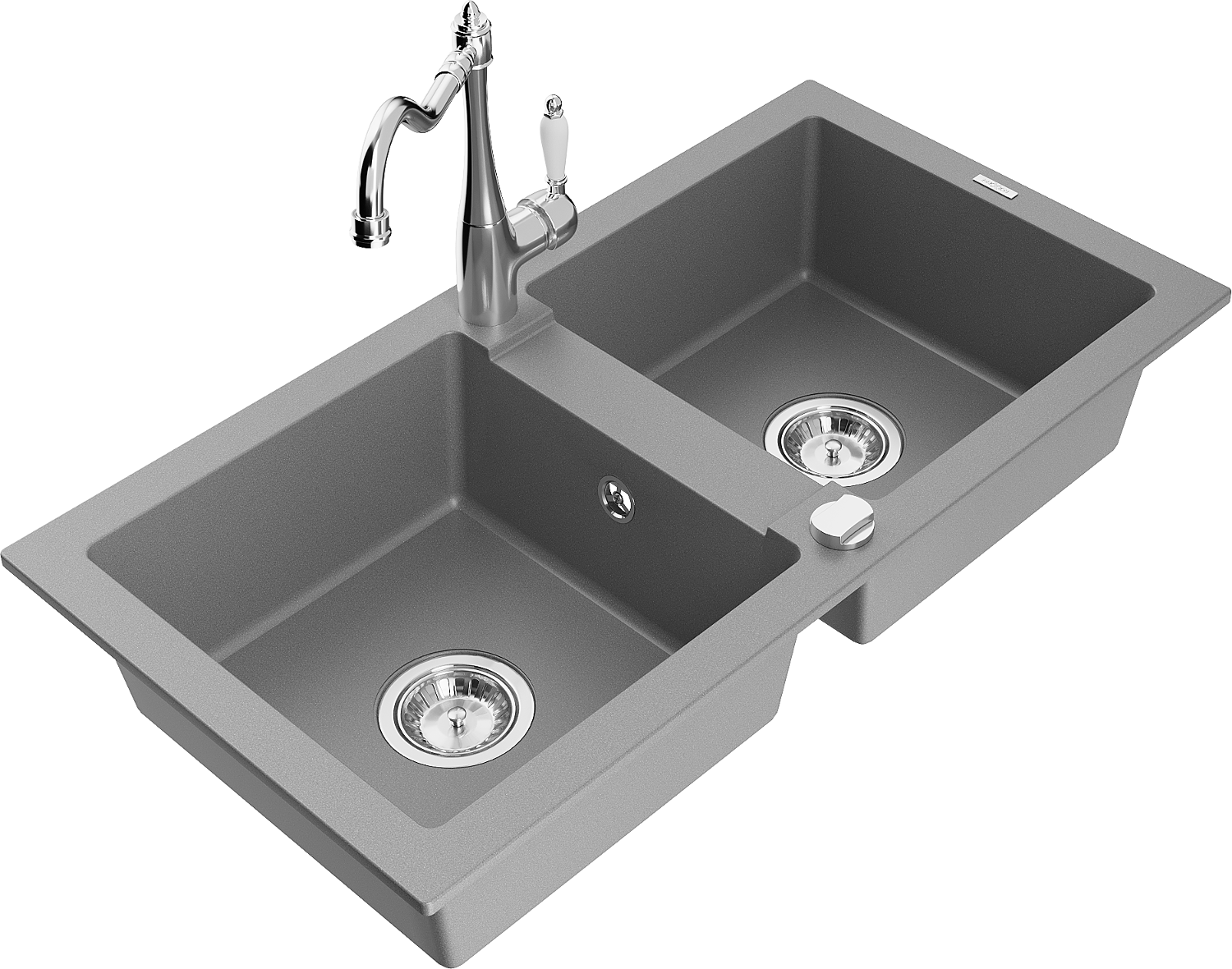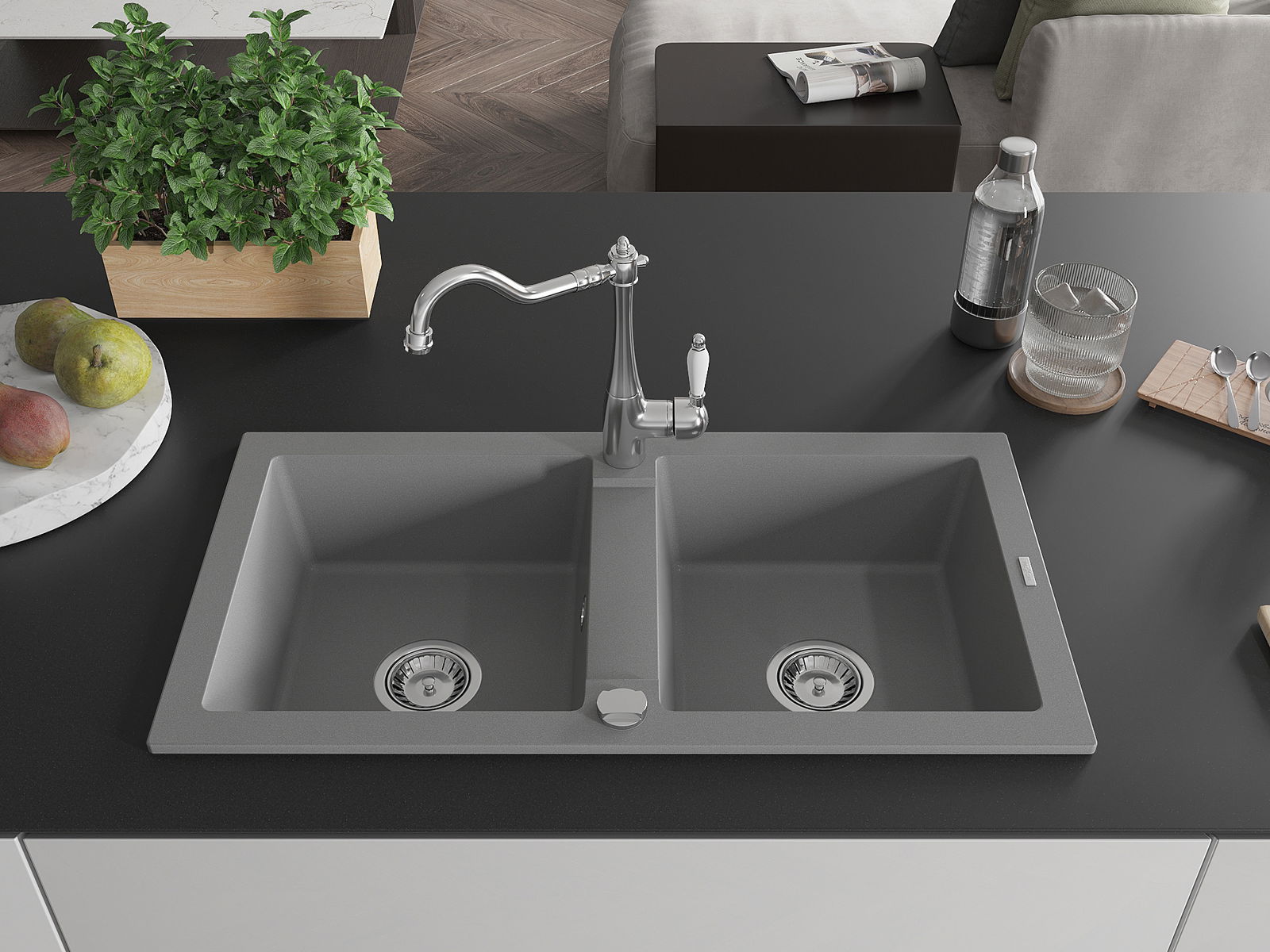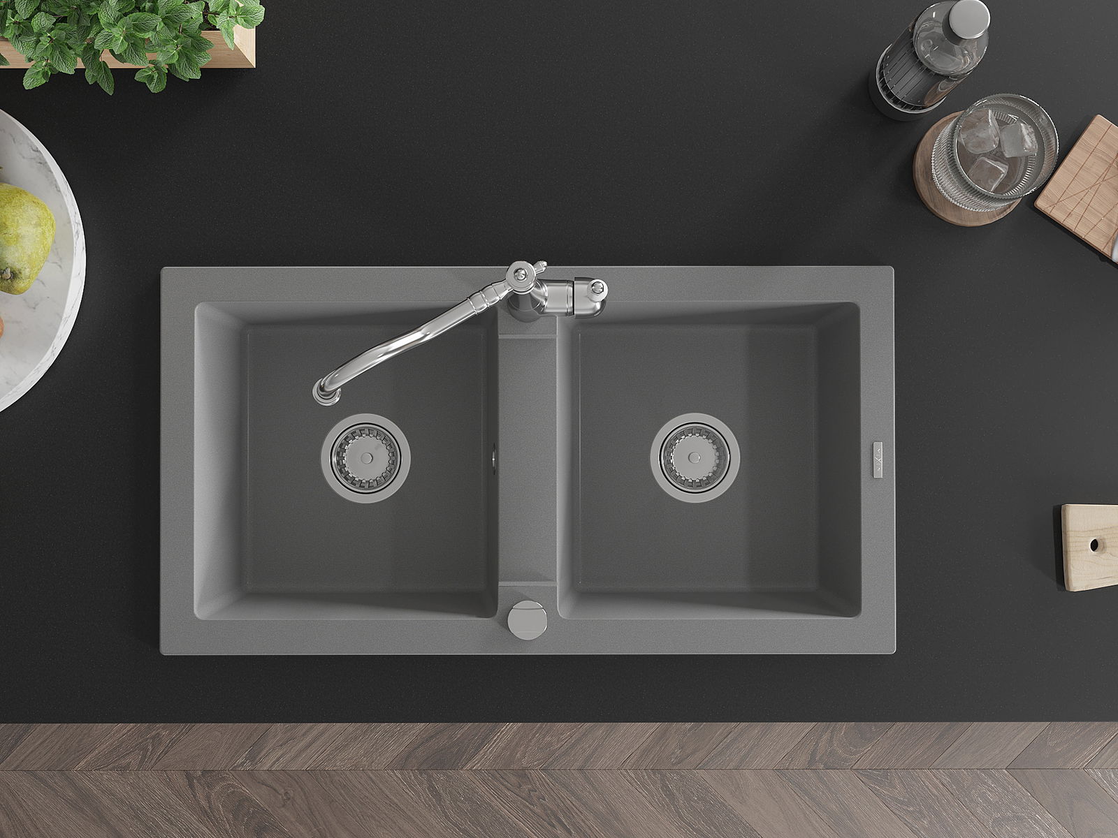 Mexen Mario Granitspüle 2-beckig mit Küchenarmatur Carla, grau - 6504-71-670700-00