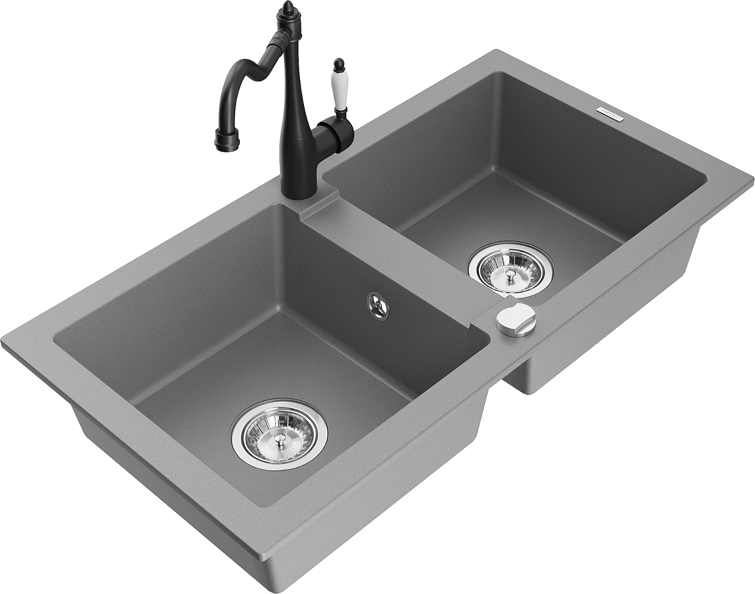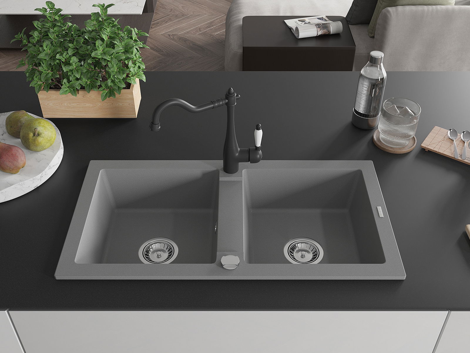 Mexen Mario Granitspüle 2-becken mit Küchenarmatur Carla, grau - 6504-71-670700-70