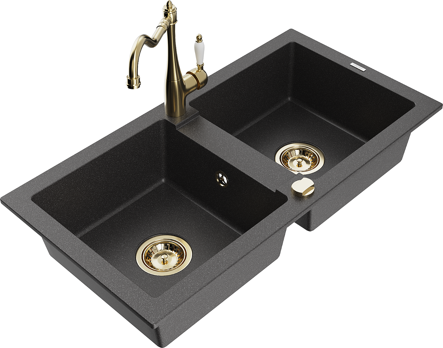 Mexen Mario Granitspüle 2-Kammer mit Küchenarmatur Carla, schwarz gesprenkelt - 6504-76-670700-50