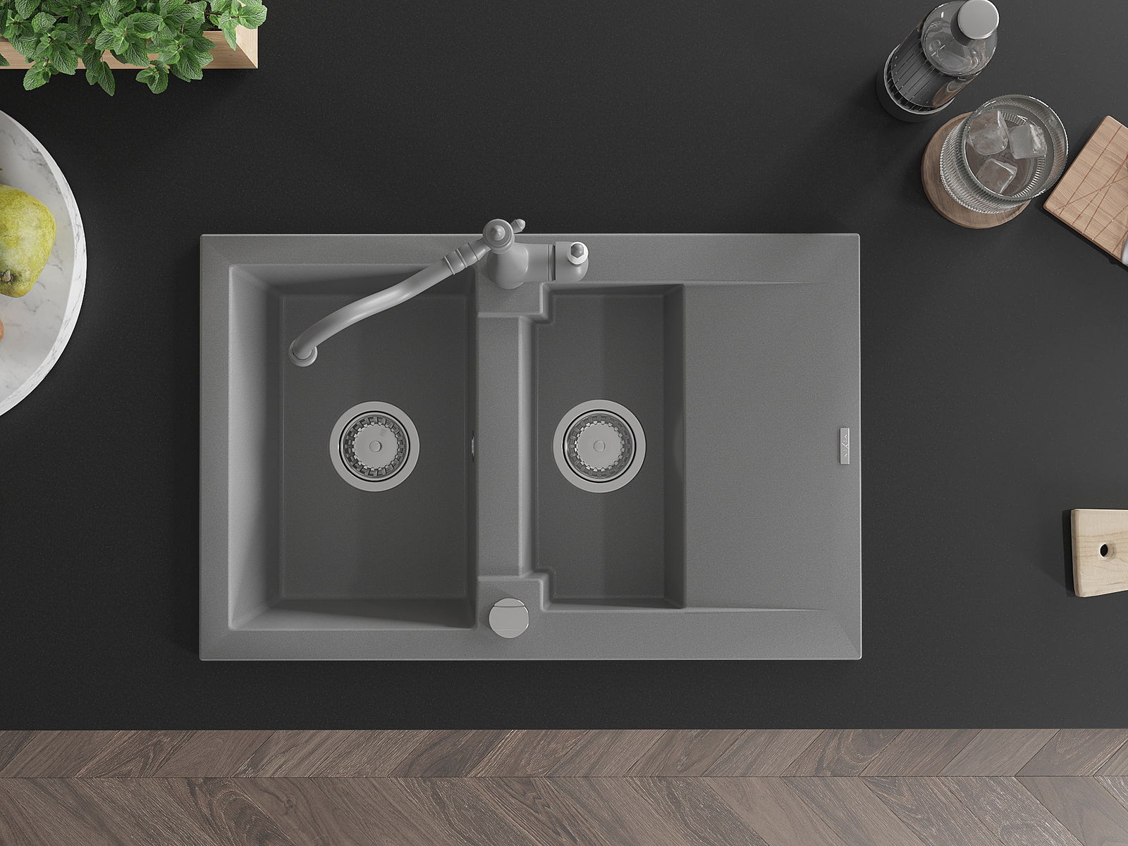 Die Spüle besteht aus hochwertigem Granit. Es ist eine elegante und vor allem praktische Ergänzung zu jeder Küche, unabhängig von ihrem Stil. Hohe Qualität und Granitdauer sorgen für eine langjährige Nutzung.