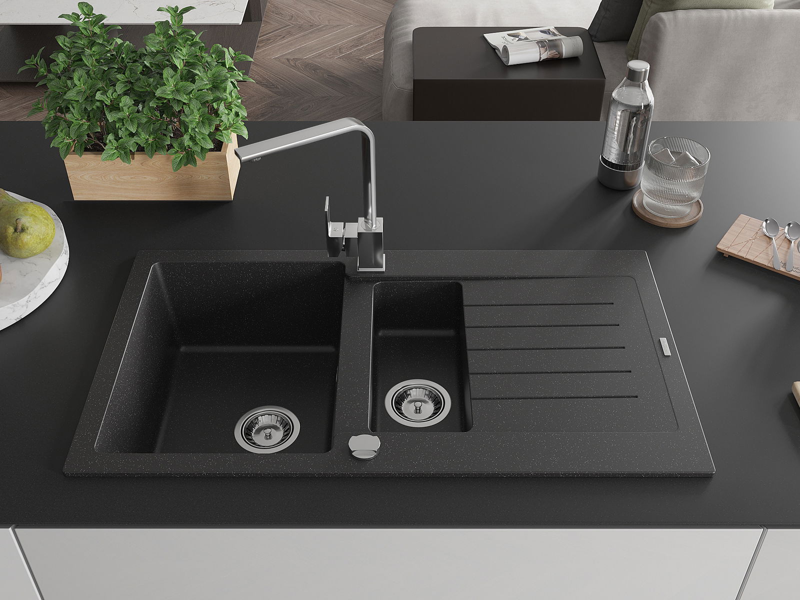 Die Spüle besteht aus hochwertigem Granit. Es ist eine elegante und vor allem praktische Ergänzung zu jeder Küche, unabhängig von ihrem Stil. Hohe Qualität und Granitdauer sorgen für eine langjährige Nutzung.