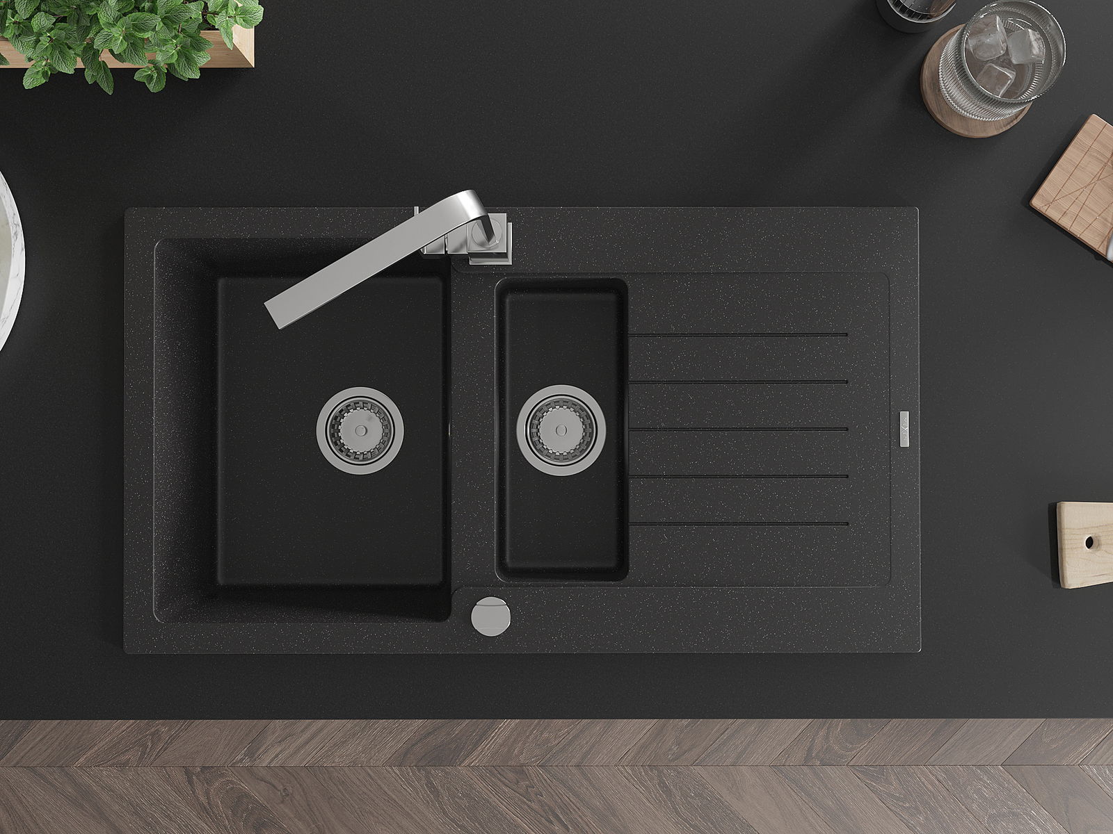 Dank des universellen Montagesystems ist die Spüle reversibel und der Abfluss kann links oder rechts auf der Theke montiert werden. Auf diese Weise können Sie die Seite einfach an Ihre Bedürfnisse und Bedingungen einstellen.