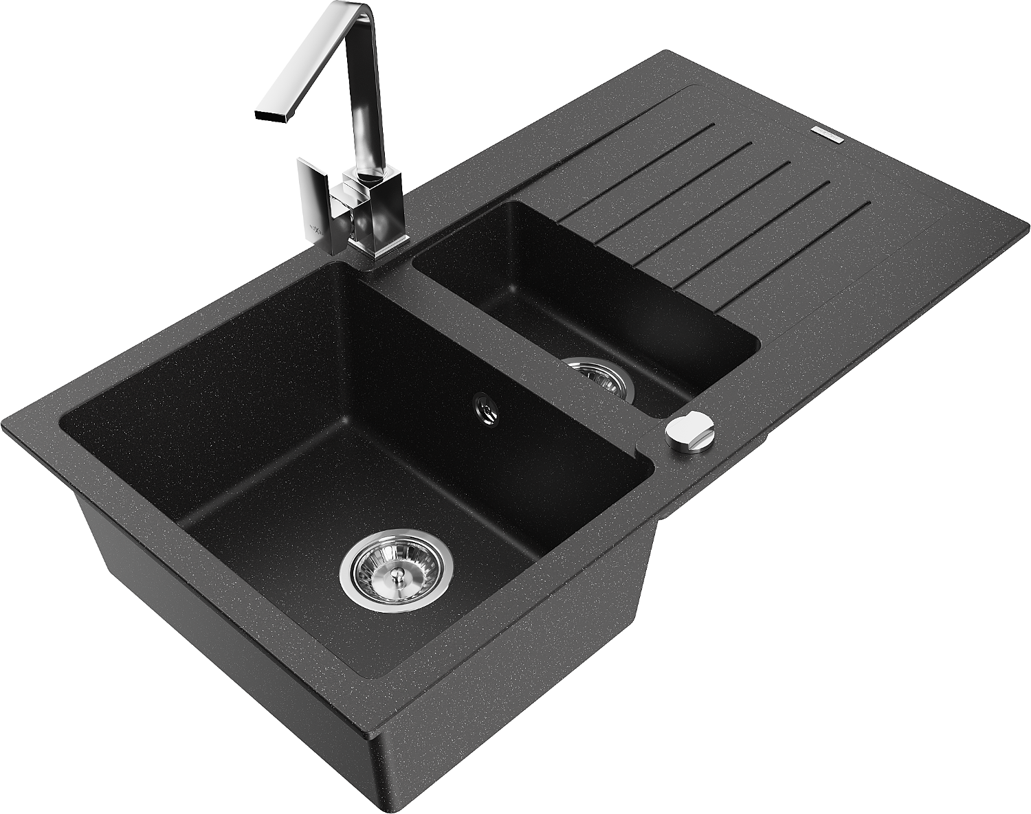 Mexen Matias Granitspüle 1,5-Becken mit Abtropffläche und Küchenarmatur Rita, schwarz/silber metallic - 6502-73-670300-00