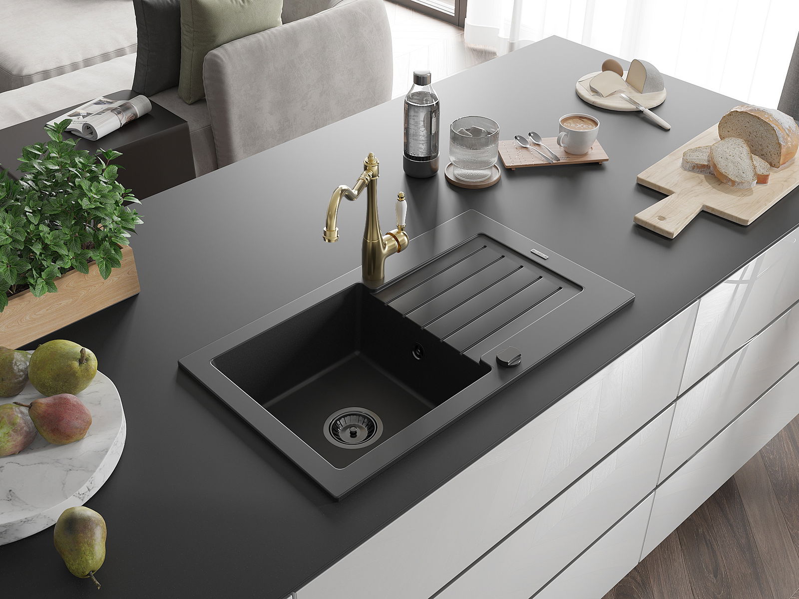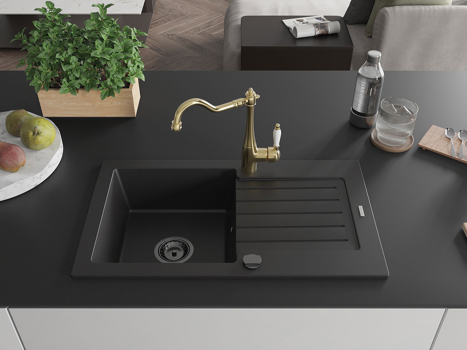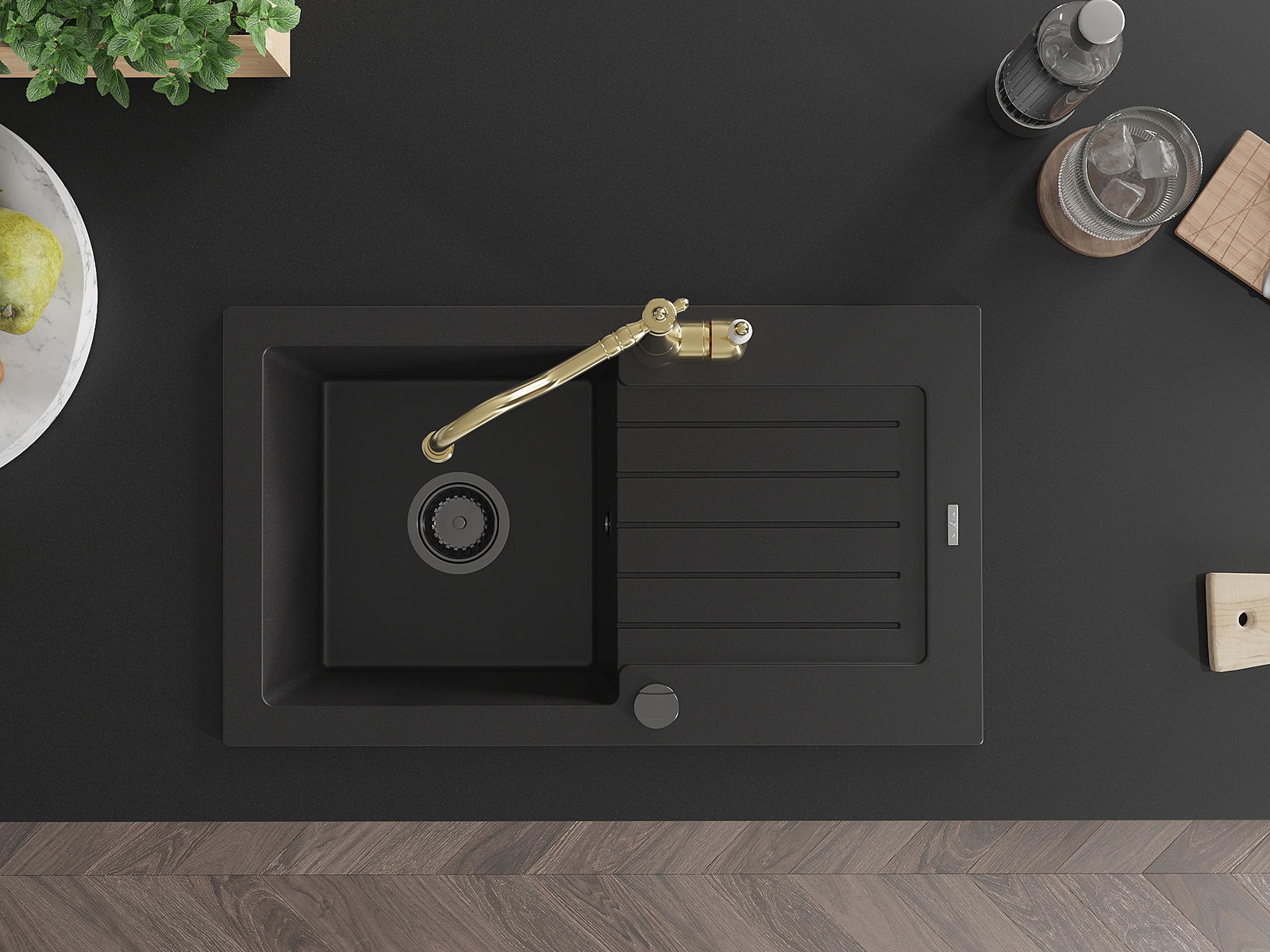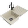 Die Spüle besteht aus hochwertigem Granit. Es ist eine elegante und vor allem praktische Ergänzung zu jeder Küche, unabhängig von ihrem Stil. Hohe Qualität und Granitdauer sorgen für eine langjährige Nutzung.
