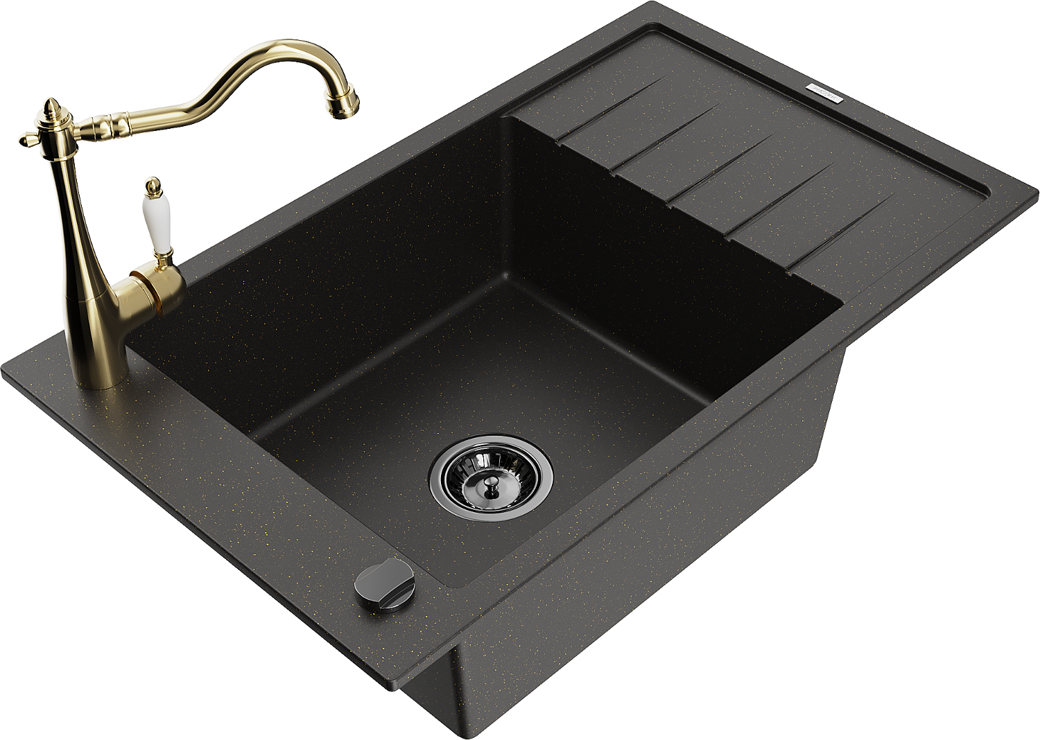 Mexen Elias 1-Komponenten-Granitspüle mit Abtropffläche und Küchenarmatur Carla, schwarz/gold metallisch - 6511-75-670700-50-B