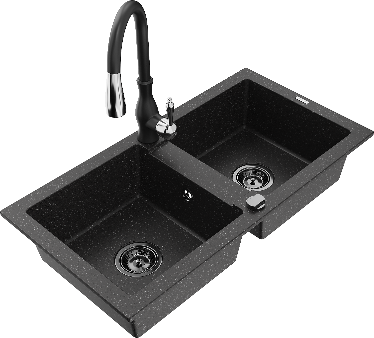 Mexen Mario Granitspüle 2-beckig mit Küchenarmatur Savita, schwarz/silber metallic - 6504-73-672601-70-B