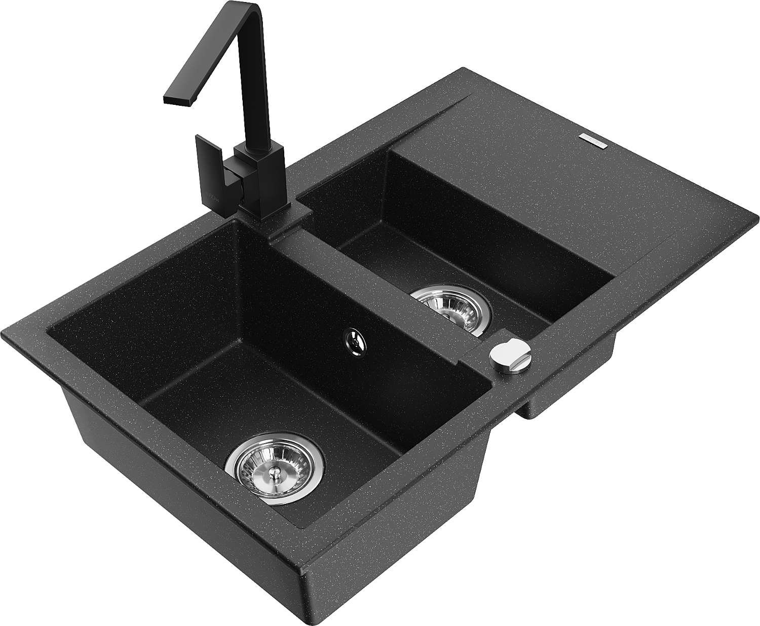 Mexen Gaspar Granitspüle 1,5-Kammer mit Abtropffläche und Küchenarmatur Rita, schwarz/silber metallic - 6507-73-670300-70