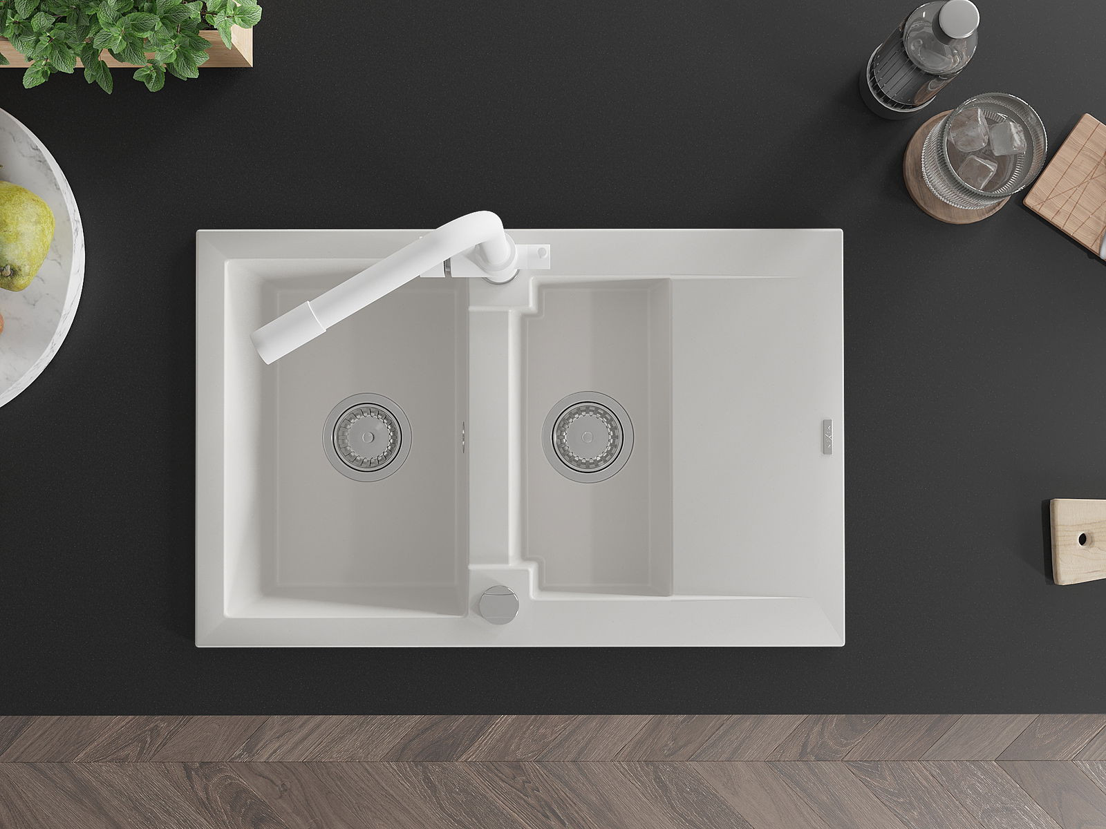 Mexen Gaspar Granitspüle 1,5-Becken mit Abtropffläche und Küchenarmatur Duero, weiß - 6507-20-671600-20