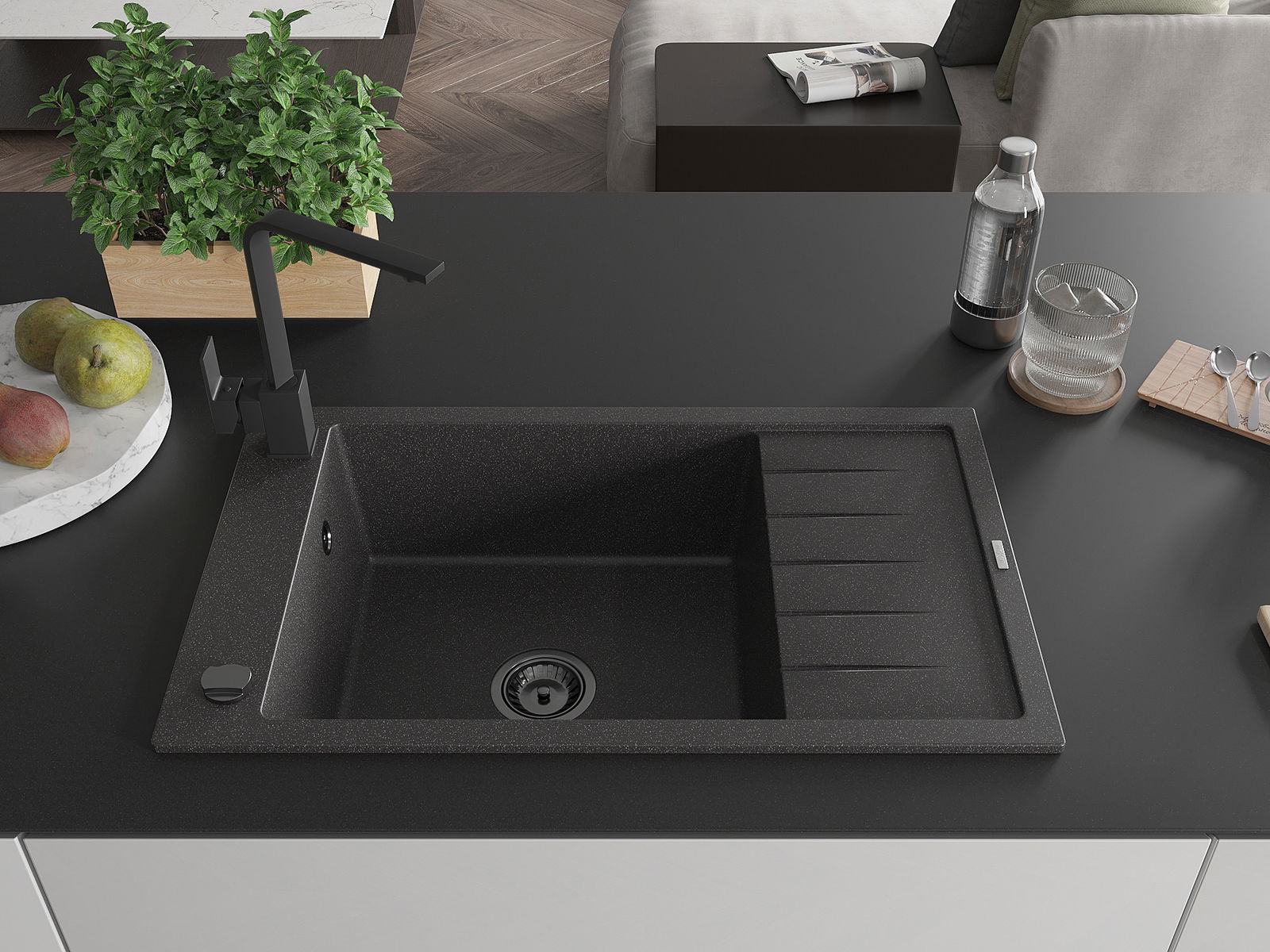 Die Spüle besteht aus hochwertigem Granit. Es ist eine elegante und vor allem praktische Ergänzung zu jeder Küche, unabhängig von ihrem Stil. Hohe Qualität und Granitdauer sorgen für eine langjährige Nutzung.
